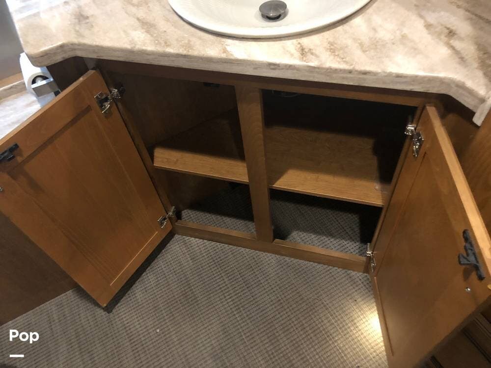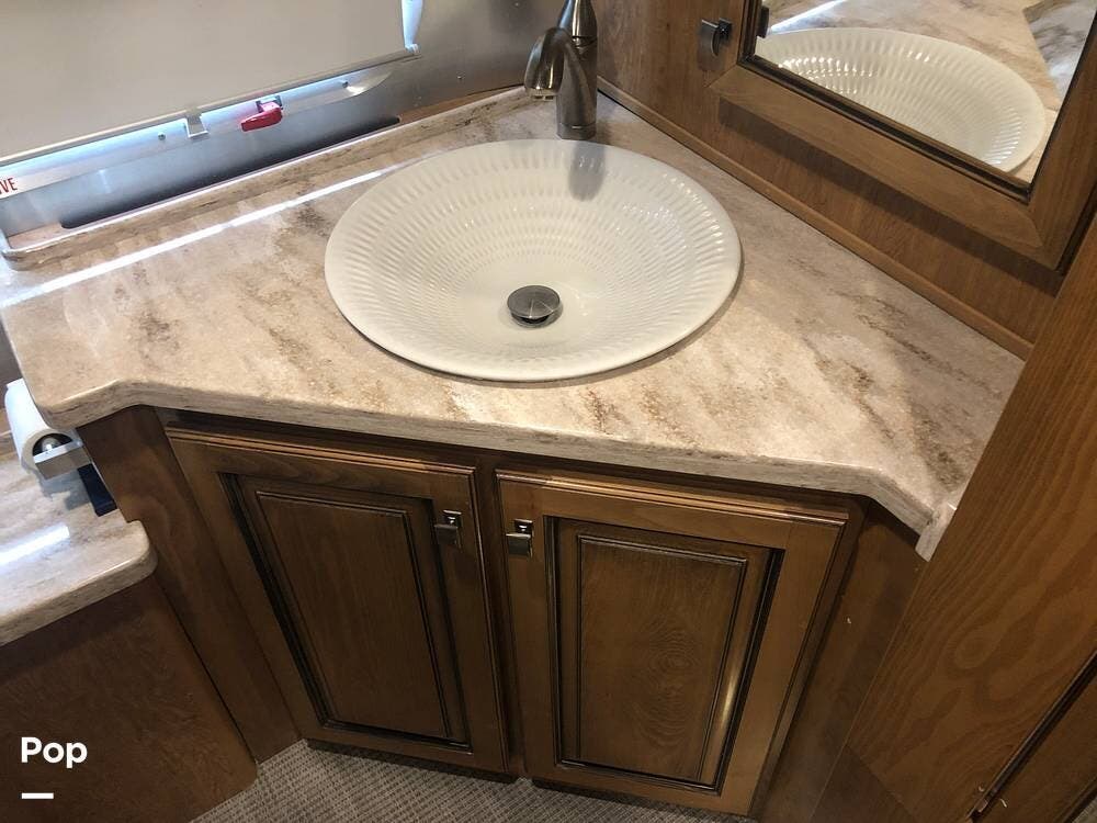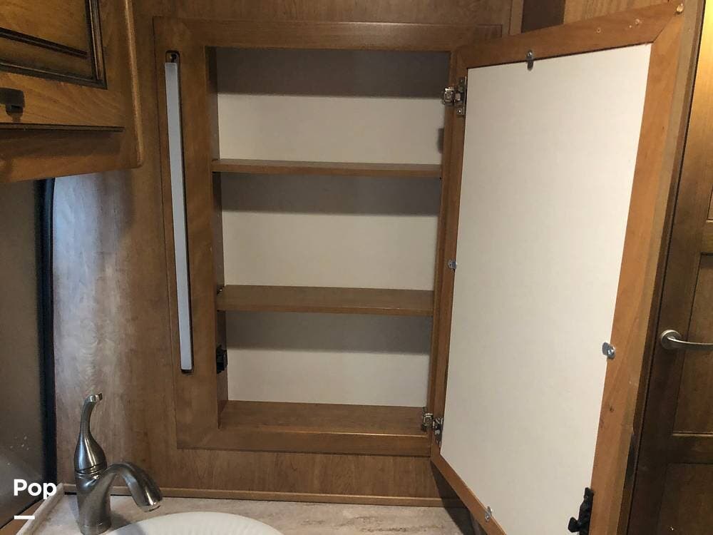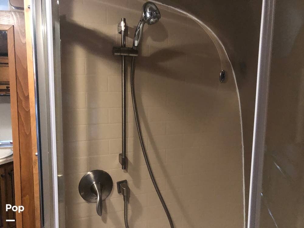 At the rear of the 33 FB is a full-beam bathroom. With a large shower, toilet, vanity, and more than enough storage!
