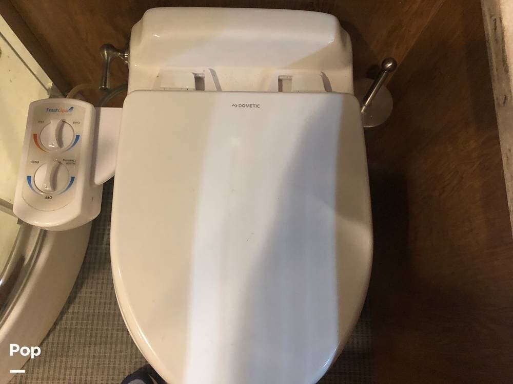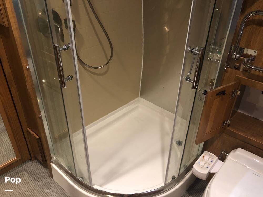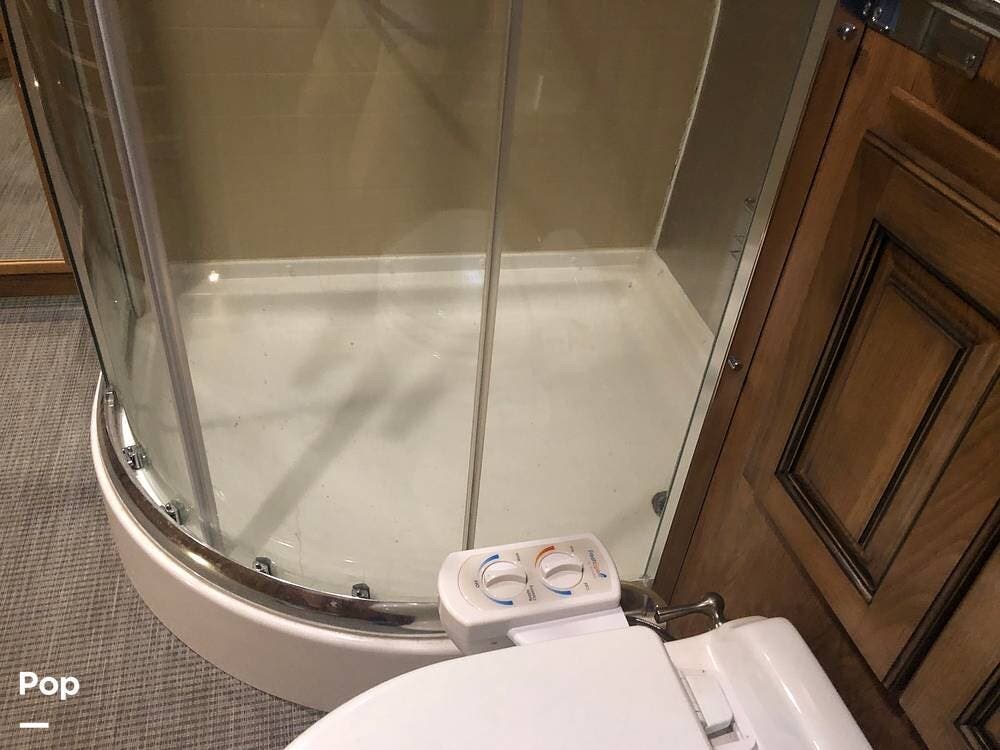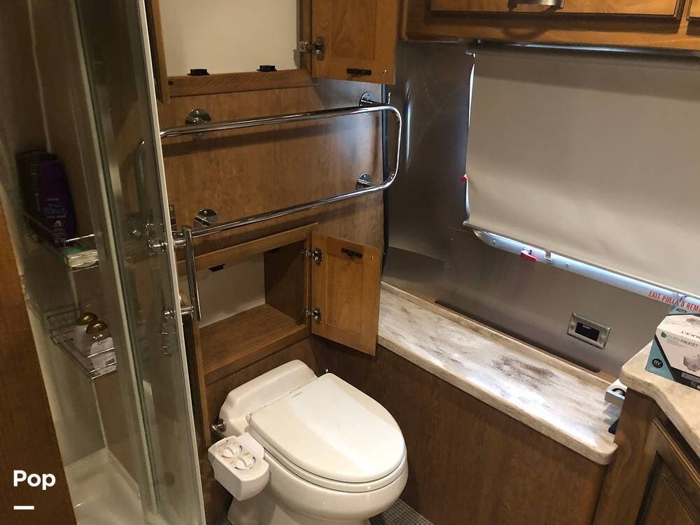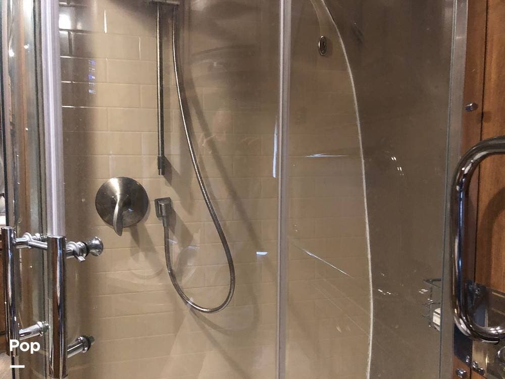 At the rear of the 33 FB is a full-beam bathroom. With a large shower, toilet, vanity, and more than enough storage!