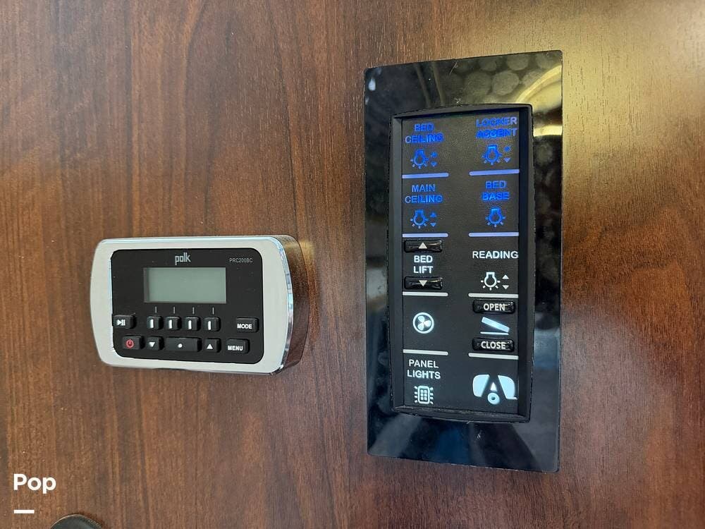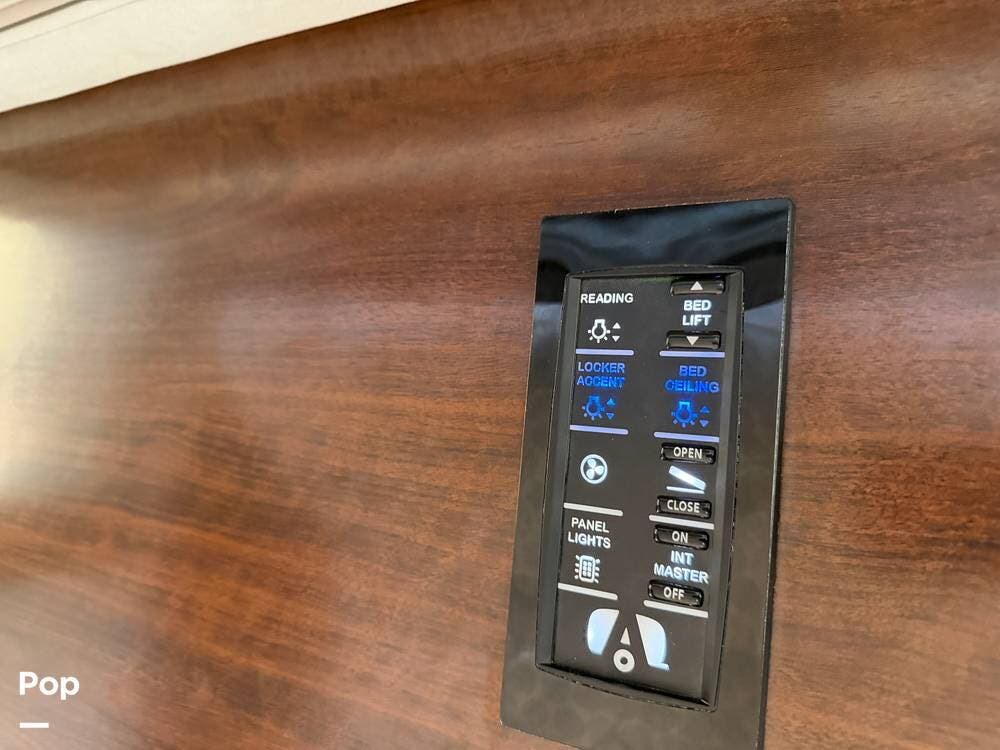 The master bedroom includes a powered Queen-size bed with a memory foam mattress and plenty of under-bed storage, Oceanair day/night shades, and overhead controls.