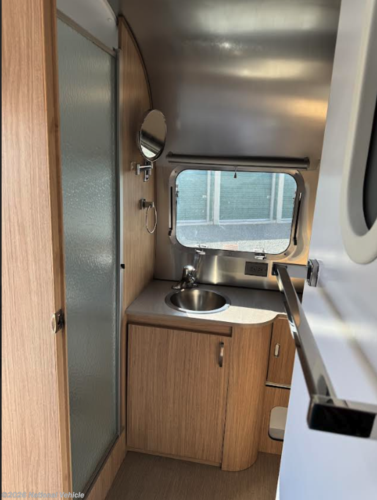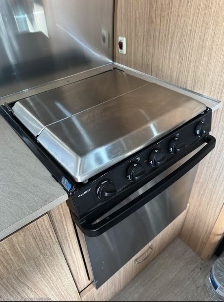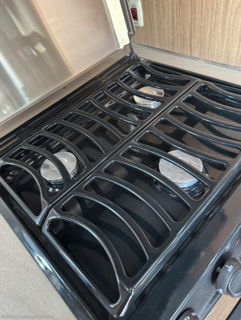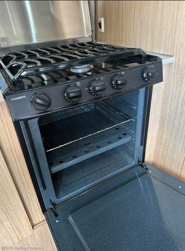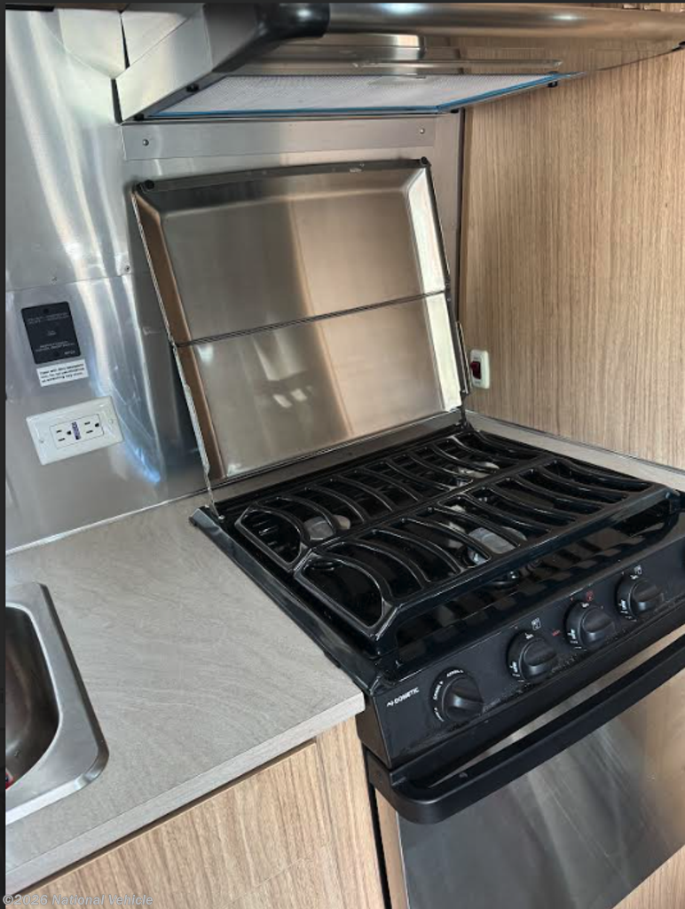 Inside, the front bedroom features a comfortable queen bed with panoramic windows, overhead storage, and privacy curtains, creating a relaxing retreat after a day of adventure. The mid-living area includes a dinette that converts to an additional sleeping space, while the rear kitchen offers everything you need for meal prep?a stainless-steel sink, 3-burner cooktop, microwave, and refrigerator?all accented by Airstream?s signature high-end finishes and contemporary d?cor.
