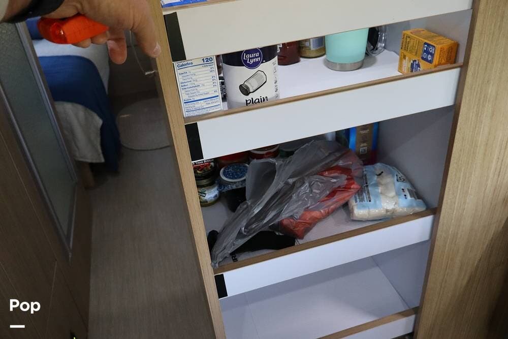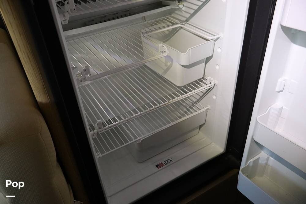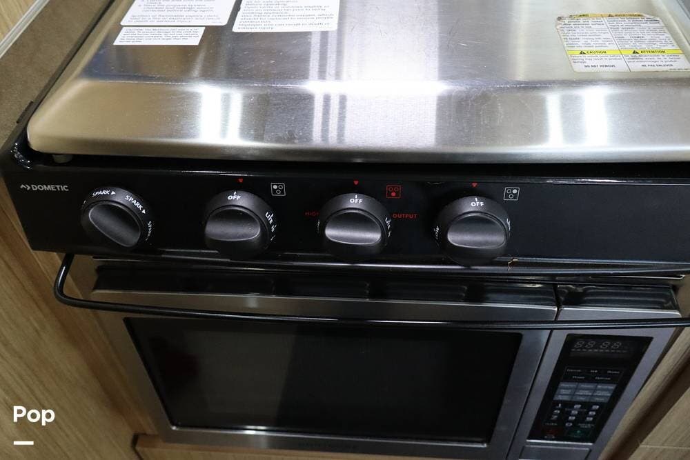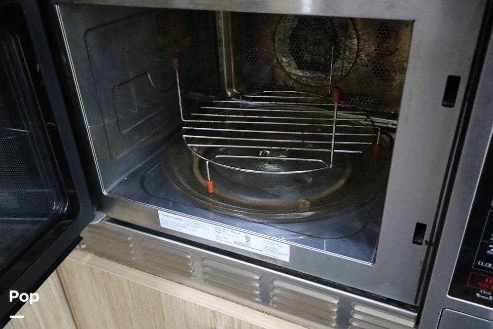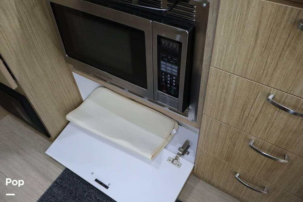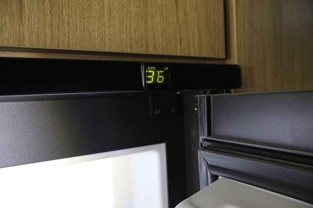 The galley kitchen is centrally located and is well-appointed for cooking on the road. Features include a 3-burner LP gas stove, microwave oven, sink, and refrigerator/freezer. It has ample storage and is provided with drawers, overhead cabinets, and a pull-out pantry.