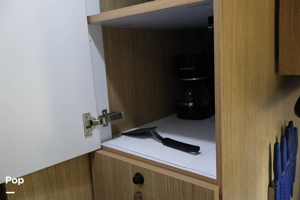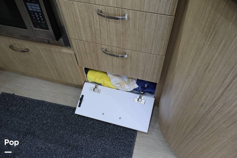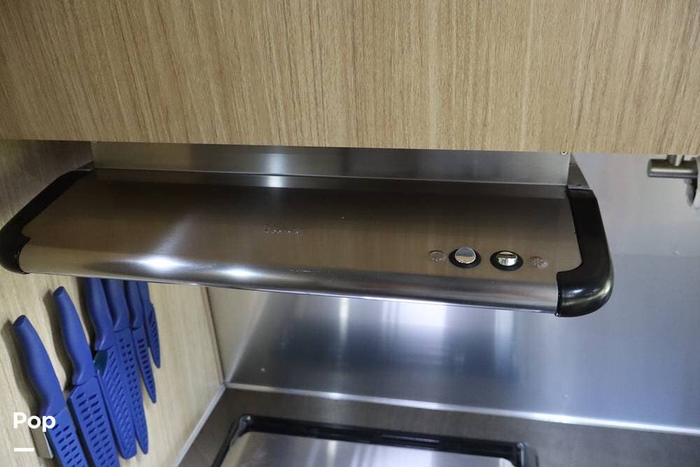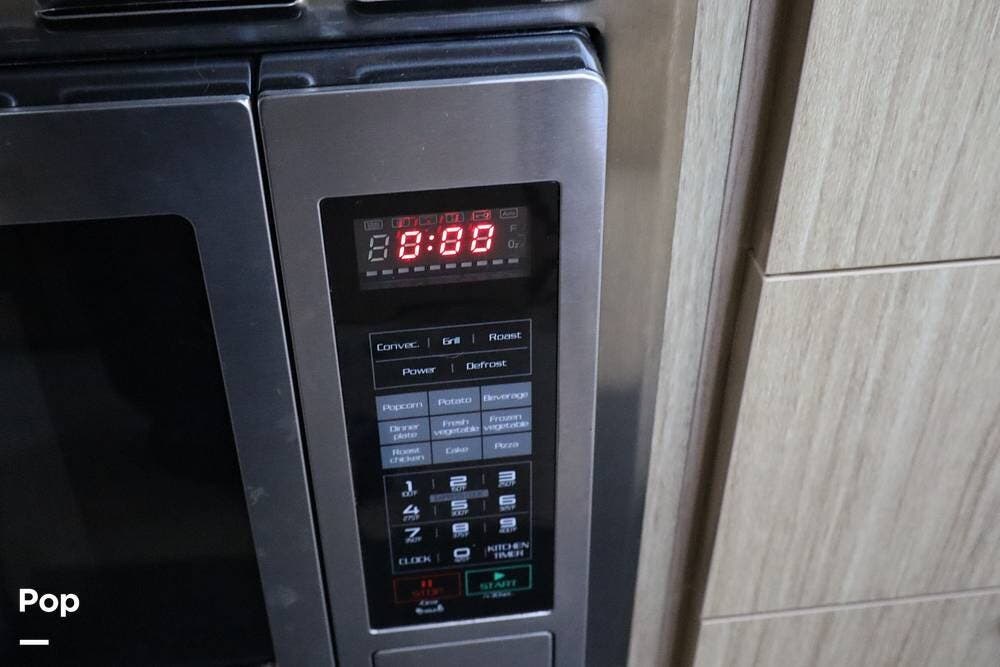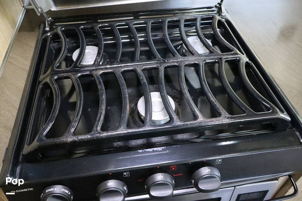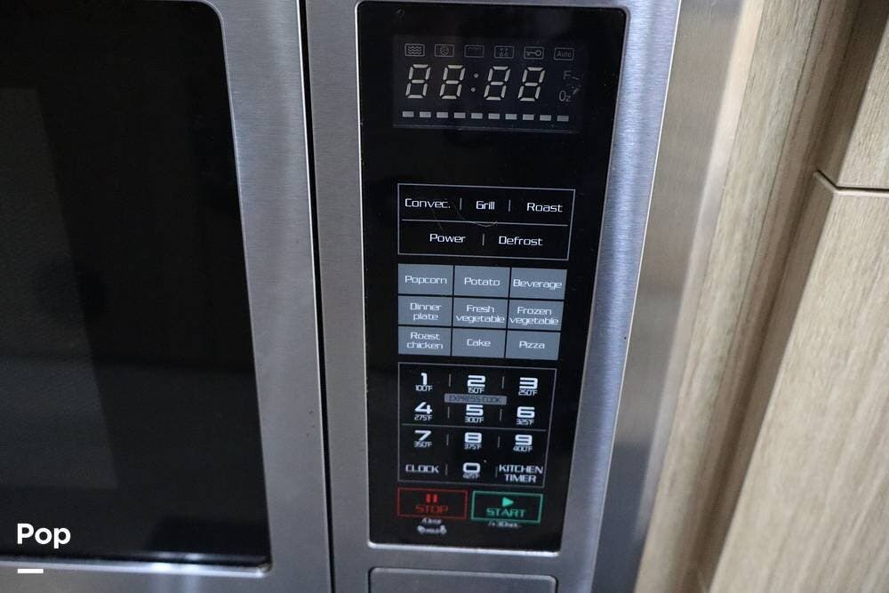 The galley kitchen is centrally located and is well-appointed for cooking on the road. Features include a 3-burner LP gas stove, microwave oven, sink, and refrigerator/freezer. It has ample storage and is provided with drawers, overhead cabinets, and a pull-out pantry.