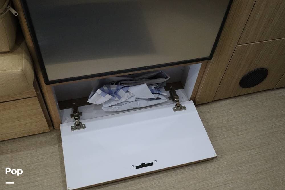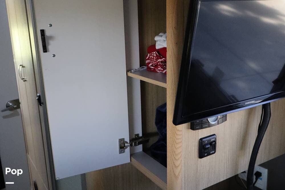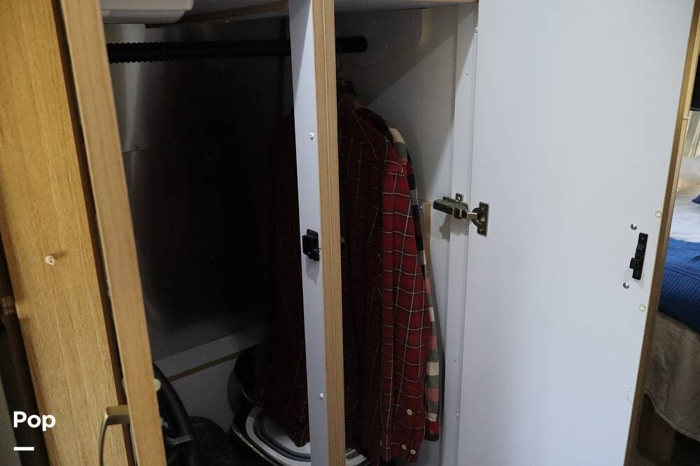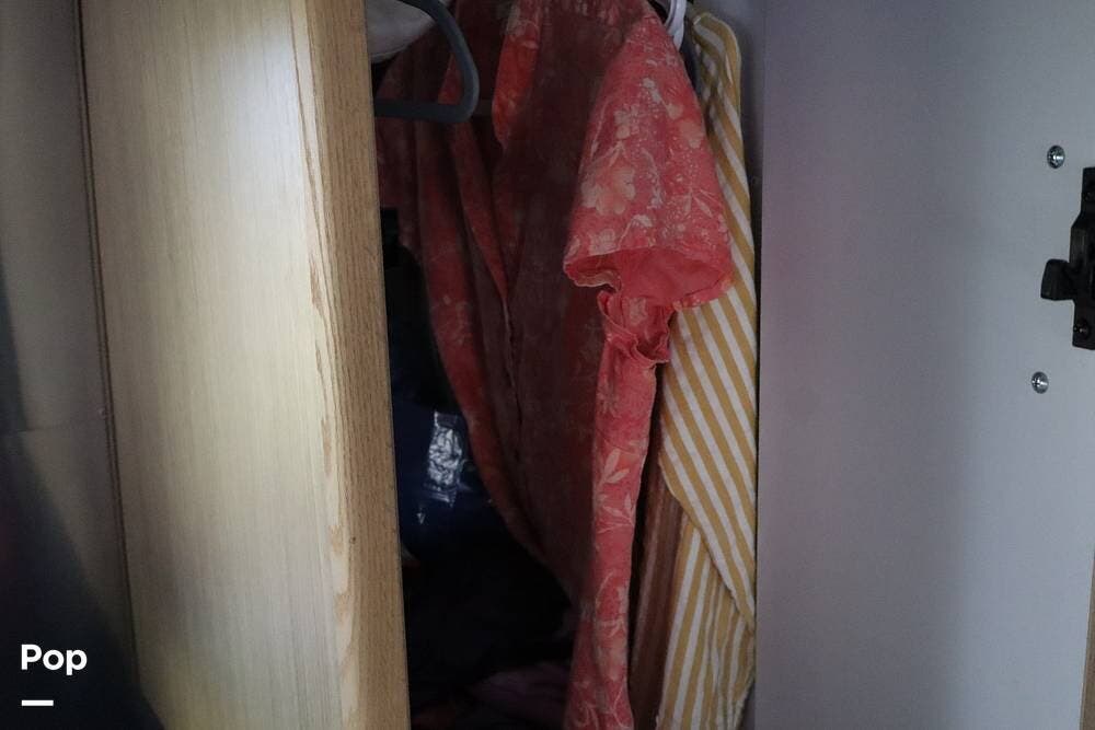 The rear bedroom features two 34" x 80" twin beds, which are longer than the optional queen bed. This layout provides an open center aisle, making it easier to move, dress, and access the nightstand and wardrobe storage. The bedroom provides nightstands, wardrobes, and under-bed storage bins. It includes a flat screen TV.