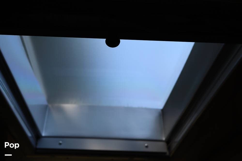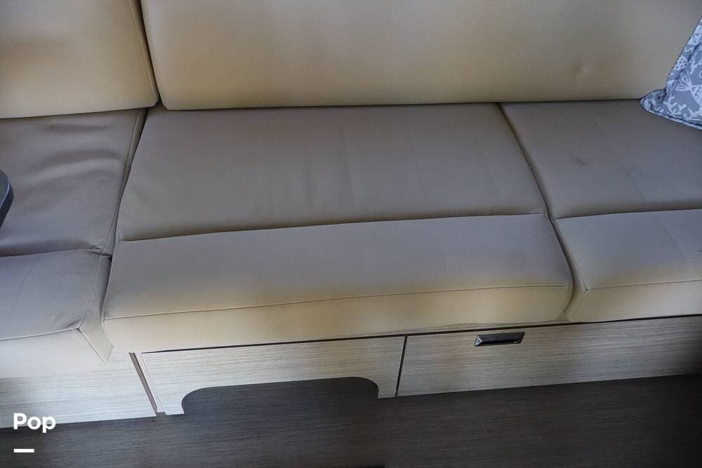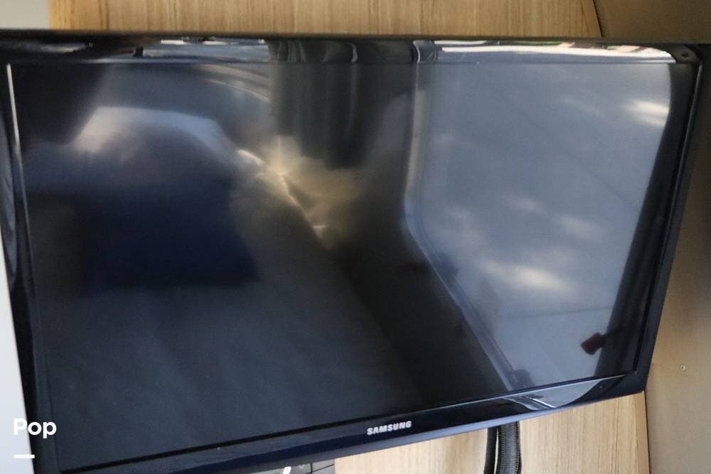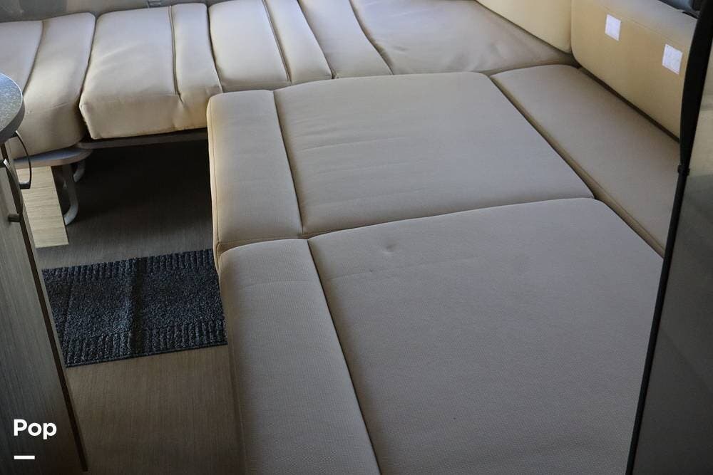 The Length is approximately 28 feet with double axles. It has a Sleeping Capacity for up to 6 people (with the convertible lounge). The front of the trailer is dedicated to a spacious lounge area. It typically features comfortable bench seating that wraps around the front end. The dinette/lounge area easily converts into an additional sleeping space for extra guests. It is equipped with a flat screen TV and a sound system.