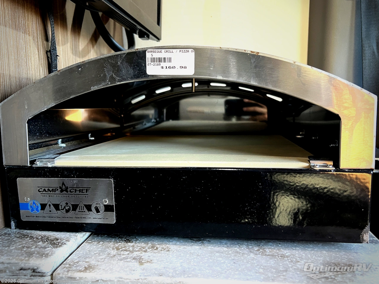 Step inside and find a convenient conversation area with the driver and passenger seats swiveled around. There is a removable table between the driver and passenger seat which allows for ease while eating or easy ability to play a game. Behind the driver's seat there is a work station and an LED TV.