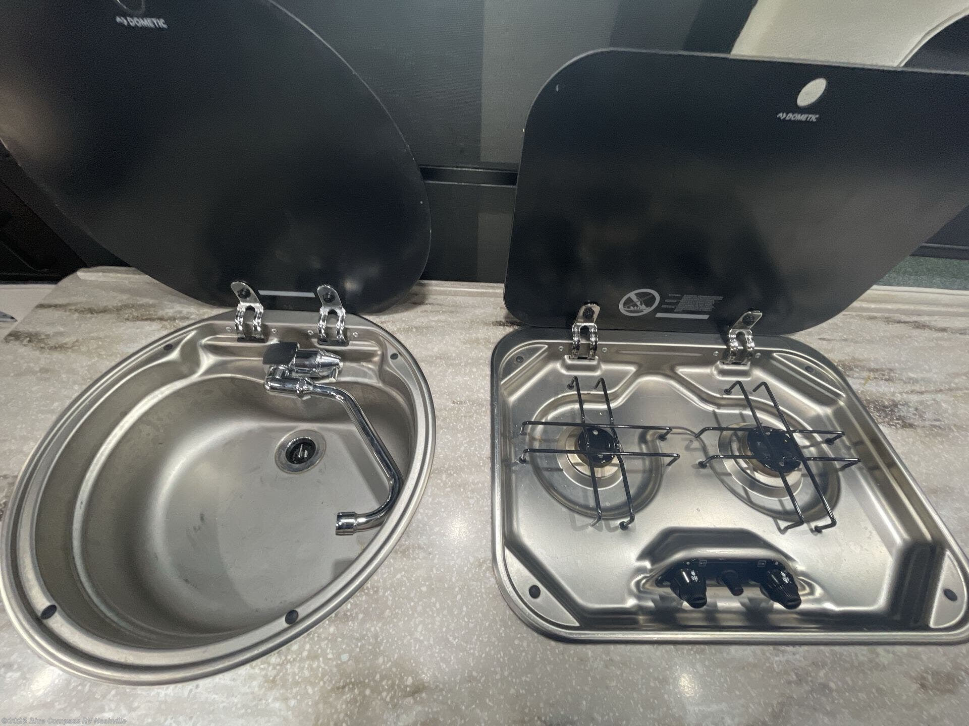 On your right side there is a round galley sink, a two burner cook-top, flip-up shelf, and overhead cabinets, plus more.