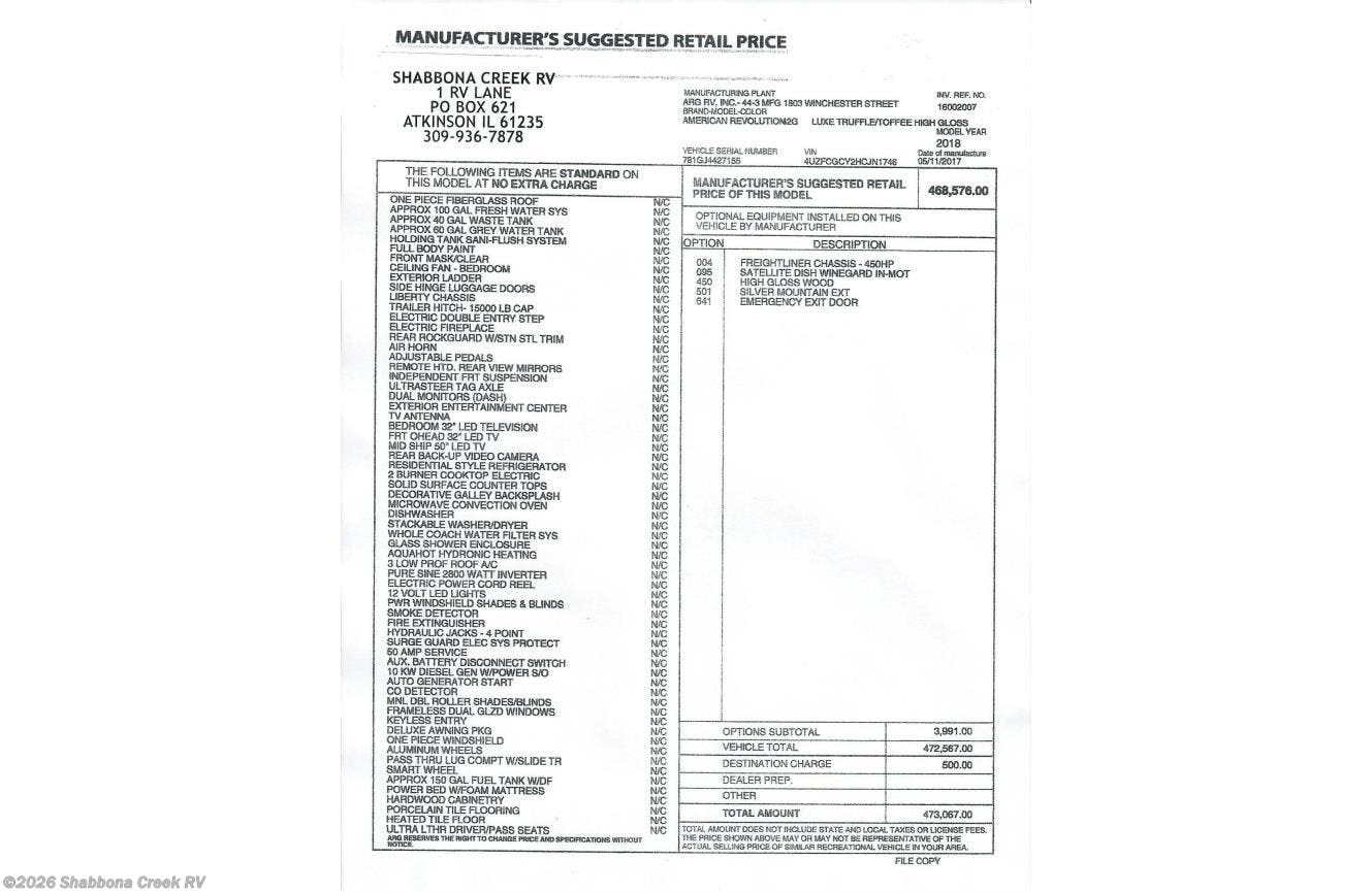 Request More Info on this 2018 American Coach American Revolution 42G * Offered for sale by Shabbona Creek RV