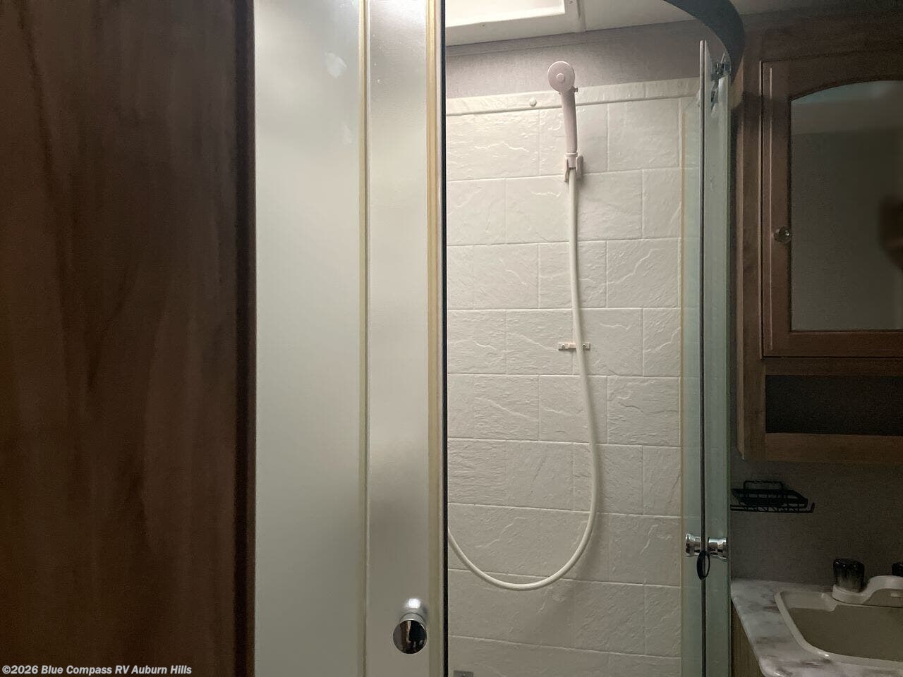 The convenient full bath is located beyond the dinette along the curbside, and features a radius shower, a toilet, and a sink.