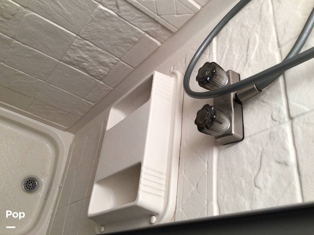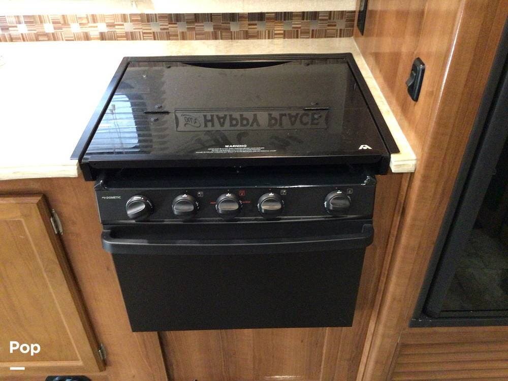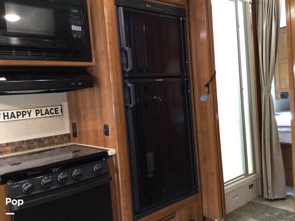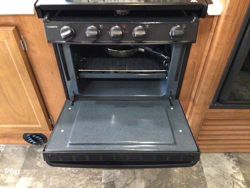 The interior galley is fully equipped with a 3-burner cooktop and oven, a double-door refrigerator, and a residential-sized microwave. The full bath includes a glass shower door and a 32" shower.