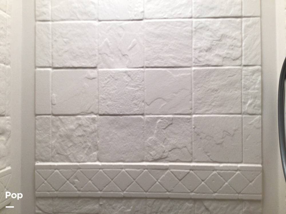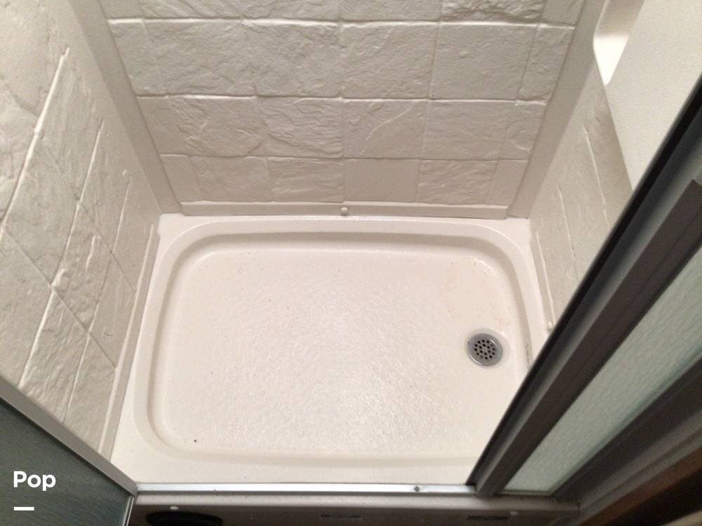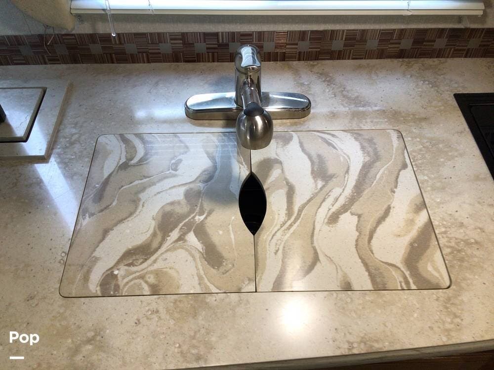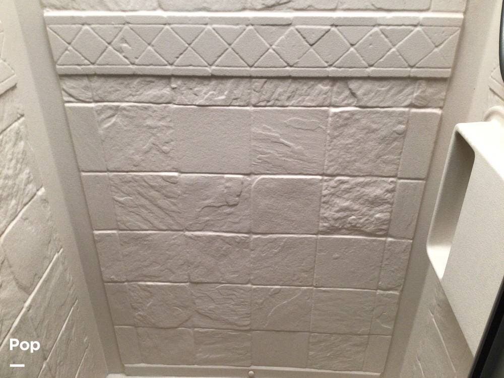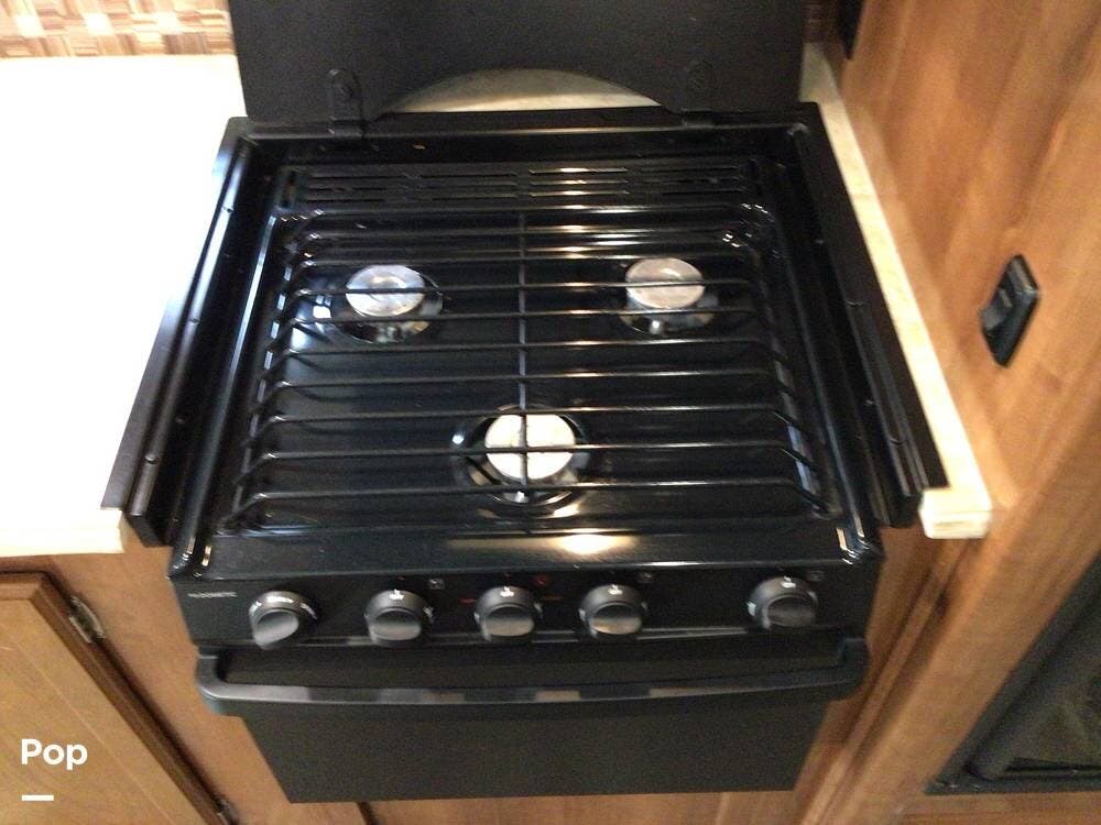 The interior galley is fully equipped with a 3-burner cooktop and oven, a double-door refrigerator, and a residential-sized microwave. The full bath includes a glass shower door and a 32" shower.