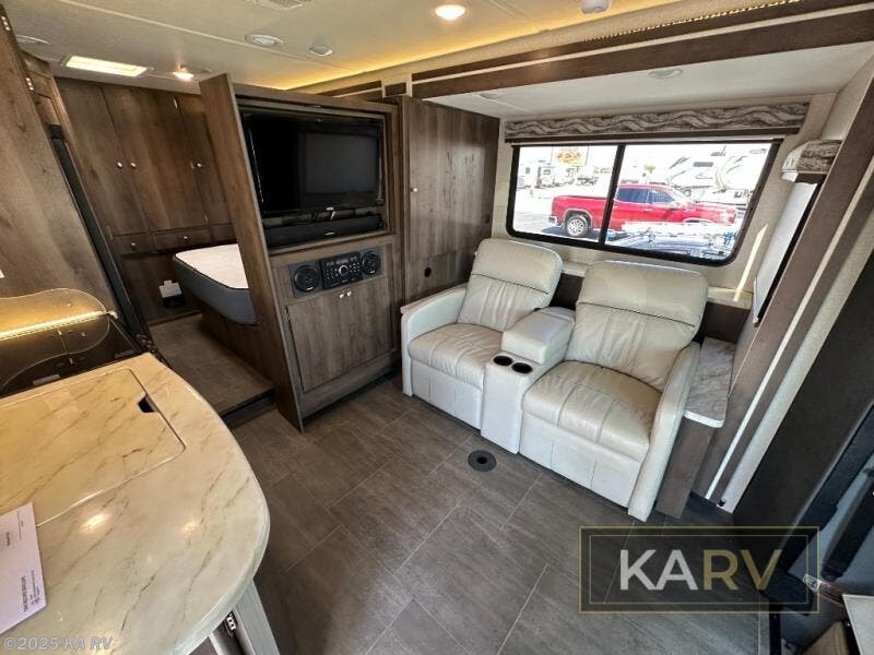 Do you dream about traveling to far destinations and enjoy attending events with the comforts of your own bathroom and bedding? This Prism Elite 24EF class C diesel motor home makes traveling and sleeping comfortable for all. In the morning you can enjoy your coffee while sitting in the driver and passenger seat with a pedestal table between. You can rest on the queen bed while the kids or your guests sleep on the cab-over bunk or U-shaped dinette once prepared for bedtime. You will appreciate the convenience of a private bathroom no matter where you travel. And the cook will surely love heating up leftovers in the convection microwave for quick meals when on the go. Come see why this RV just makes sense!