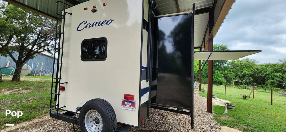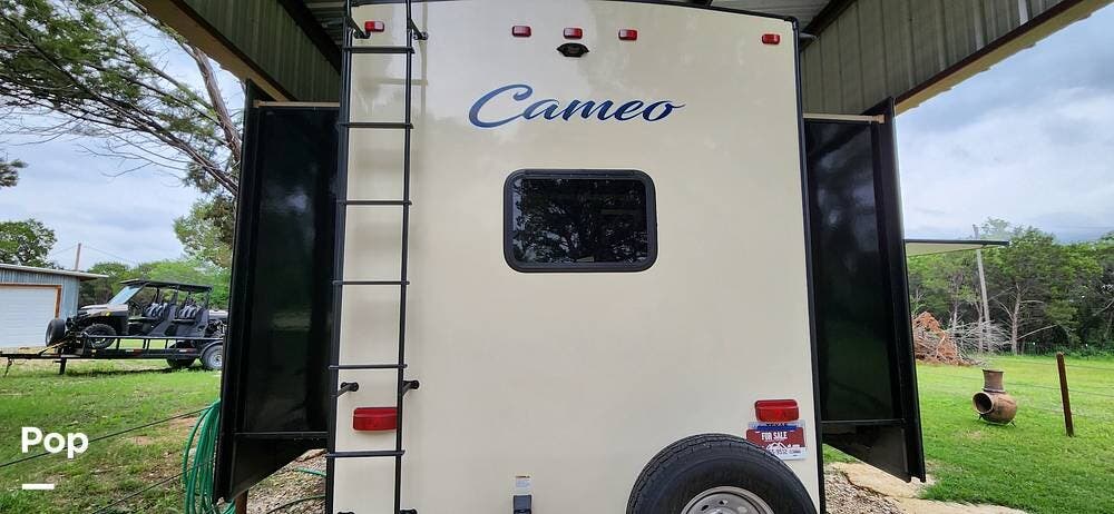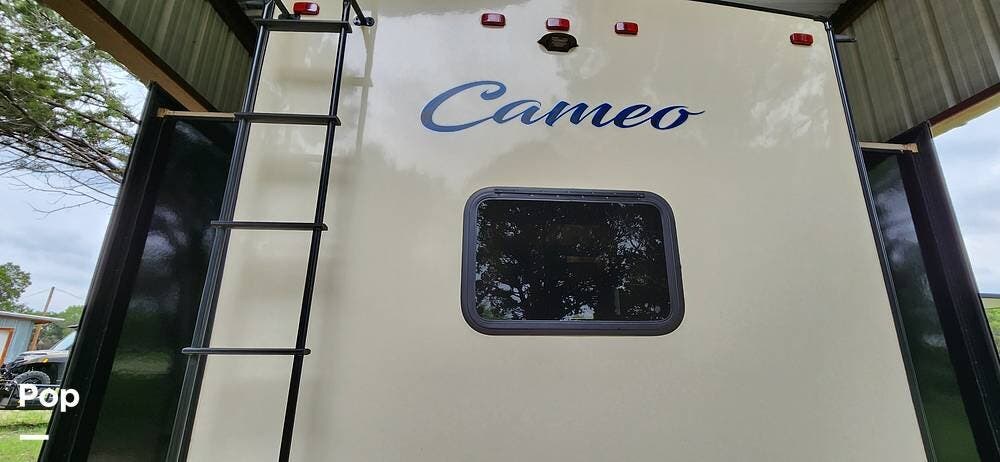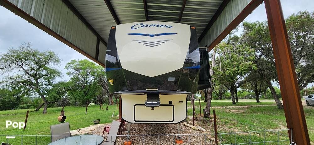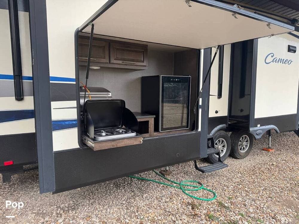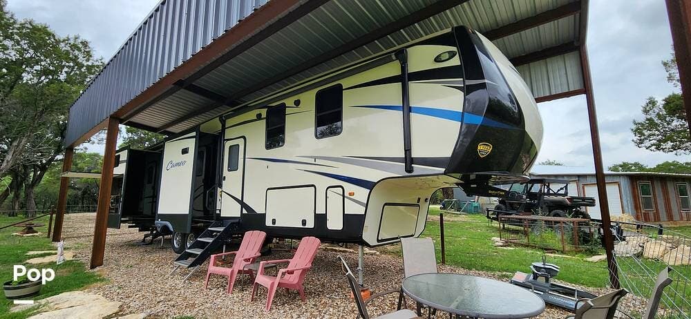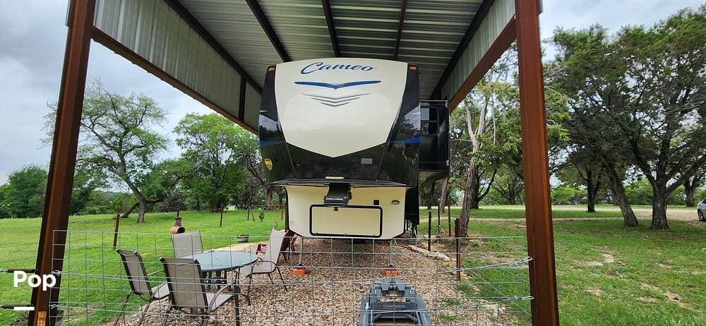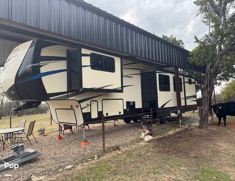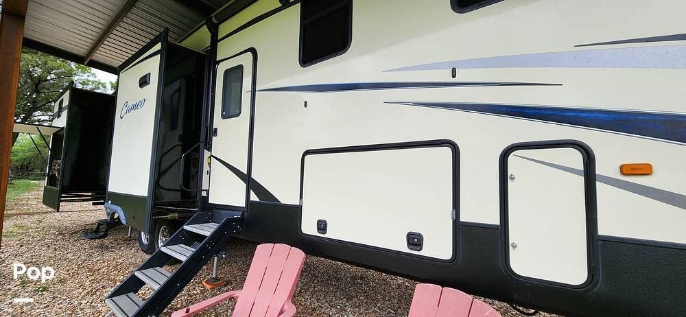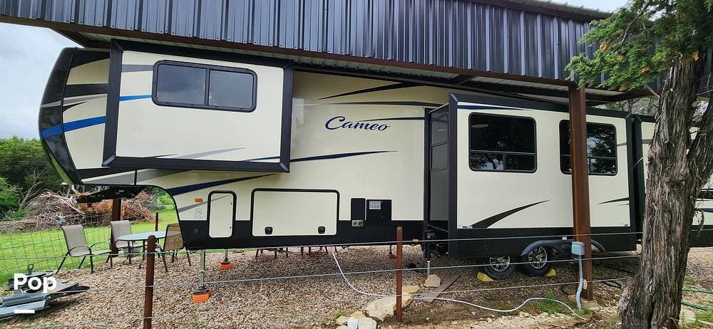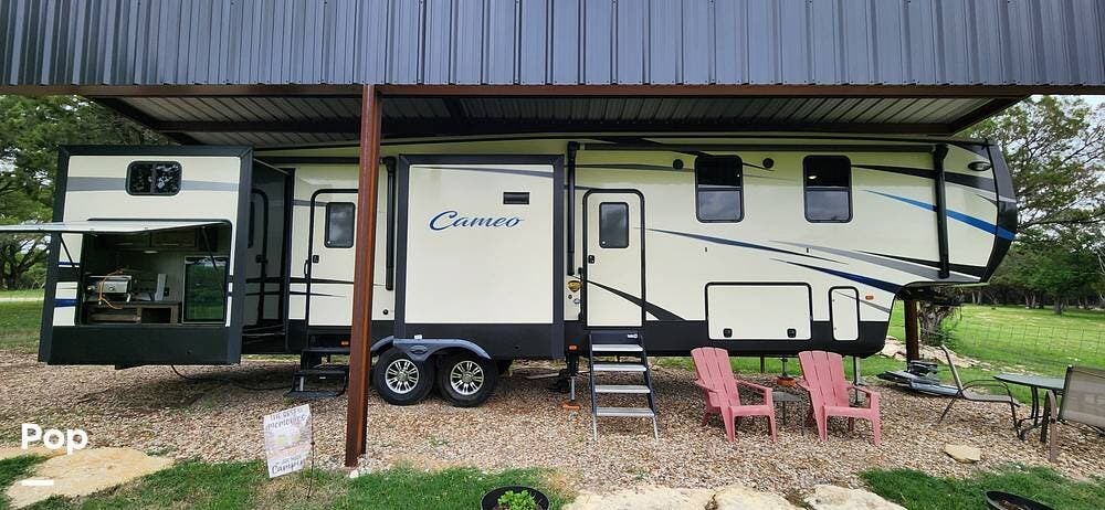 This 2018 Cameo 3851BH is a 40-foot fifth wheel in Nemo, Texas. It includes a generator, a bath and a half, a washer/dryer hookup, and remote-controlled slides!