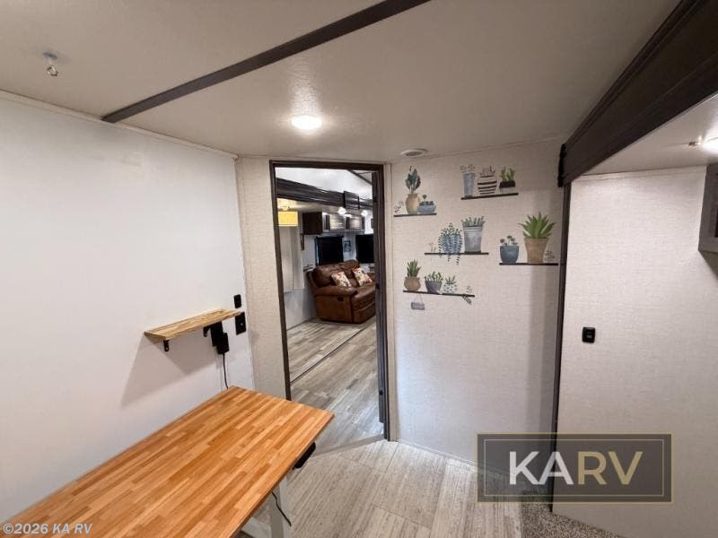 Once you take a vacation in this Cruiser fifth wheel, you will never again travel in anything else. The four slides and various sleeping areas are what give this unit its impressive capacity to sleep eight people each night, and because there have been two private bedrooms and a loft included, everyone will have a space to call their own. While the chef of the family is whipping up a delicious meal for everyone on the kitchen island, the rest of you can gather around the free-standing table with chairs for a friendly game of cards as you wait.