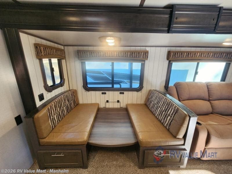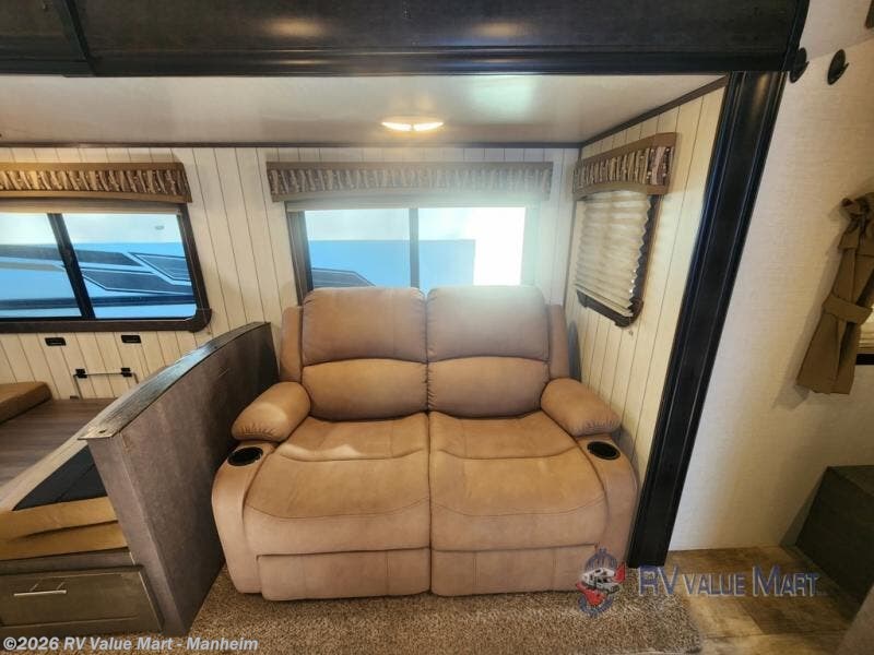 Step inside and notice how open it feels with the large sofa and booth dinette slide fully extended. This provides plenty of daytime seating for relaxing, dining, or just kicking back watching TV. If you need added space at night you can create sleeping space from either quickly. The nearby entertainment center is easily viewable from either spot.