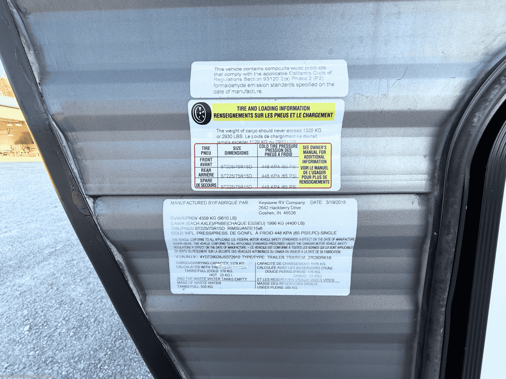 Pre-Owned 2018 Crossroads Zinger 280RK Travel Trailer; 29 Foot; 1 Slide; 30 Amp; Hitch Weight: 808 Lbs.; Dry Weight: 6570 Lbs.; Power Tongue Jacks; Manual Stabilizer Jacks; 51 Gal. Fresh Water Cap.; 44 Gal. Black Water Cap.; 88 Gal. Gray Water Cap.; Two 20 Lbs. Propane Tanks; 15,000 BTU AC; 30,000 BTU Furnace; 6 C.F. Gas/Elec. Refrigerator; 6 Gal. Gas/Elec. Water Heater; Microwave; 3-Burner Stove/Oven; Two TV Jacks; AM/FM; Speakers; One Fireplace; Lots of Storage in Kitchen/Bath; Pantry; U Shaped Dinette; Jack-knife Sofa; One Recliner; Queen Bed; One Bathroom with Shower; 18 Foot Power Awning with LED Lights; Backup Camera Prep.; Solar Prep.; Outside Kitchen with Stove; Outside Shower; Exterior Storage; Grab Handle; Black Tank Flush; Climate Package; Tinted Windows; Spare Tire; Trade In Unit; Small Dent in Front Cap; Few Blinds are Cracked (Price Reflects Condition); Financing Available; Good Pre-Owned Travel Trailer for the Price: $15,995. Call Skis Truck & RV Sales at 765-344-1111 or visit us at for more information.