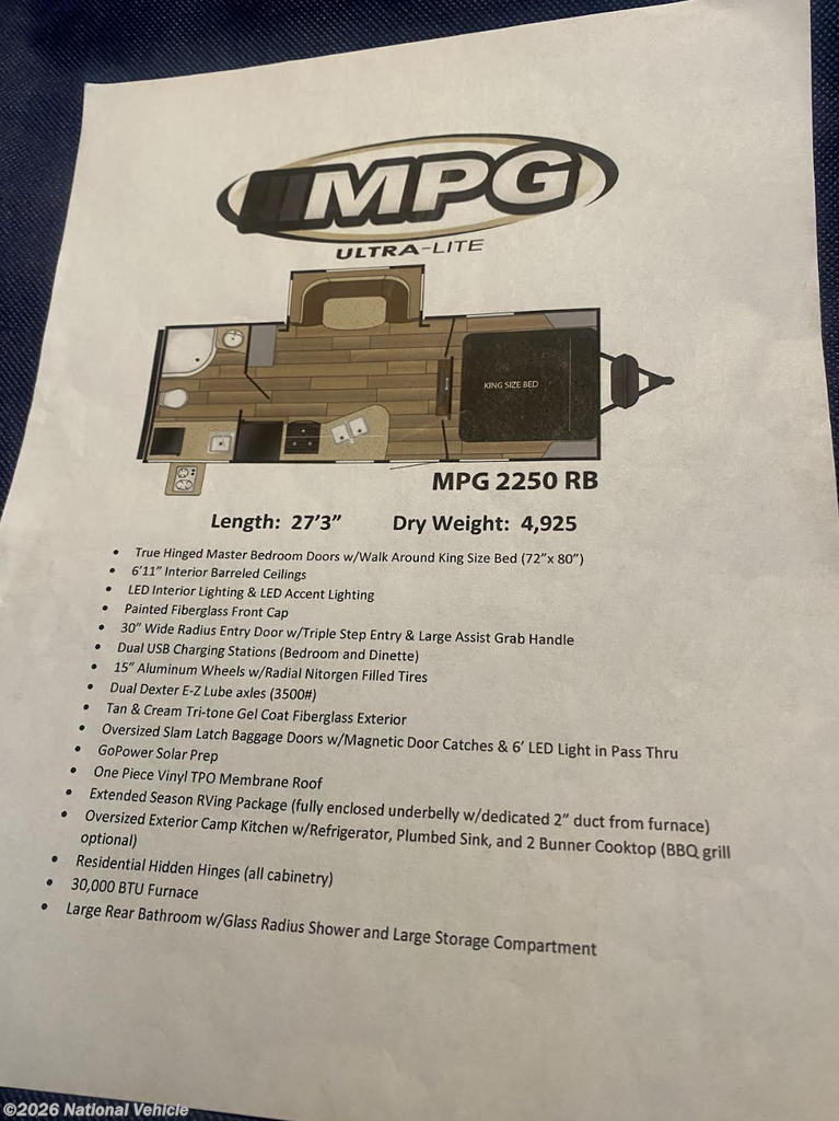 Lightweight yet durable, the MPG Ultra Lite series is built for easy towing without sacrificing quality or comfort. Whether you?re heading out for a weekend getaway or an extended adventure, this 2250RB model combines luxury, efficiency, and smart design for the perfect travel experience.