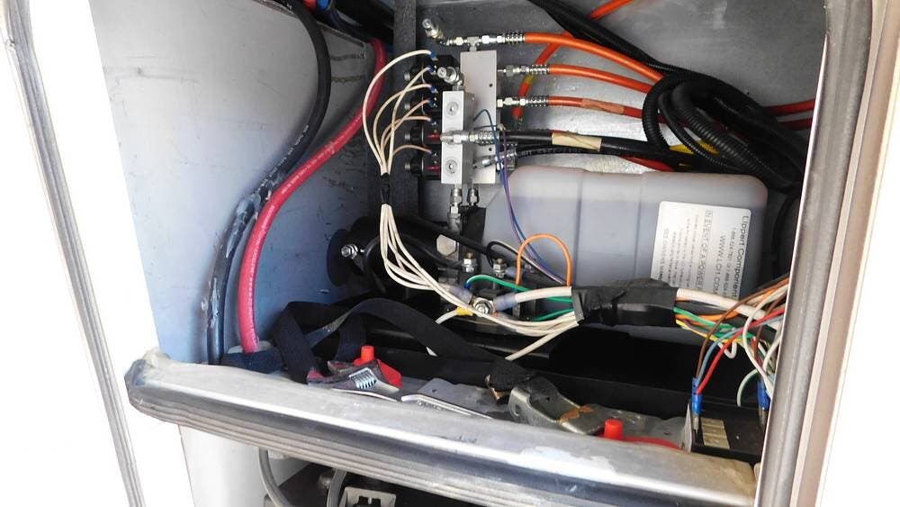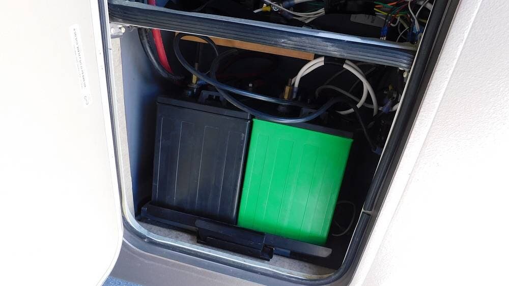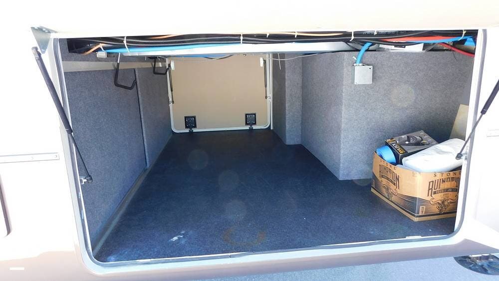 On the exterior are the spacious three slide-outs, a set of batteries, electric levelers, propane tanks, and numerous storage bays.