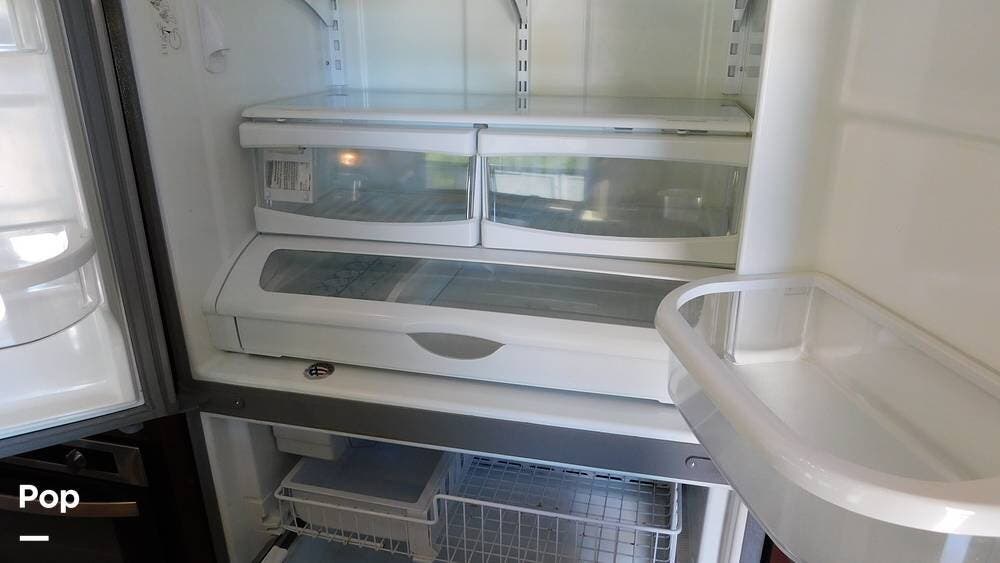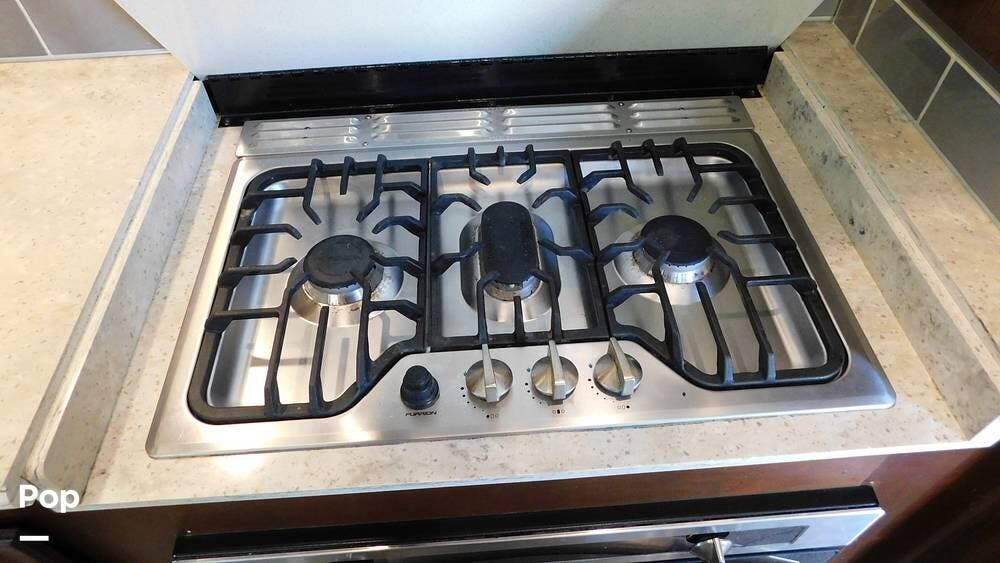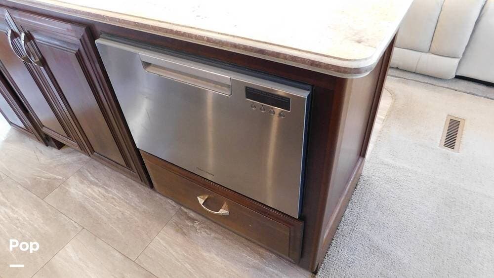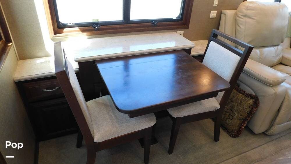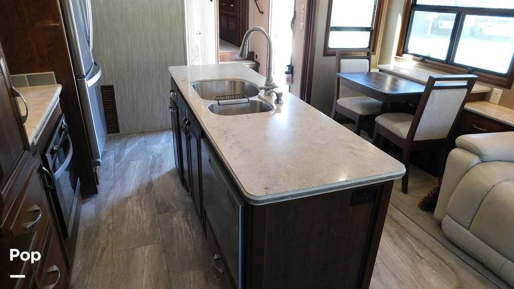 Entering the RV, the deluxe gourmet kitchen is fabulous. It has a stainless French-door residential fridge, three-burner gas stove and oven with convection microwave above, and a large center island with a stainless steel double sink and dishwasher. Opposite the island is the dining table with 2 chairs.