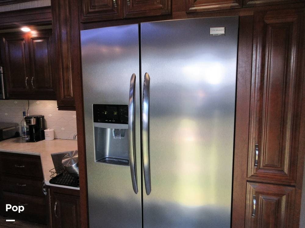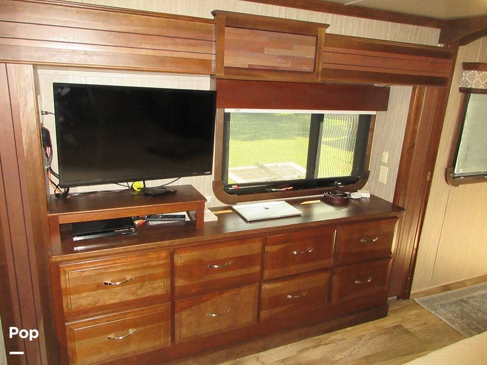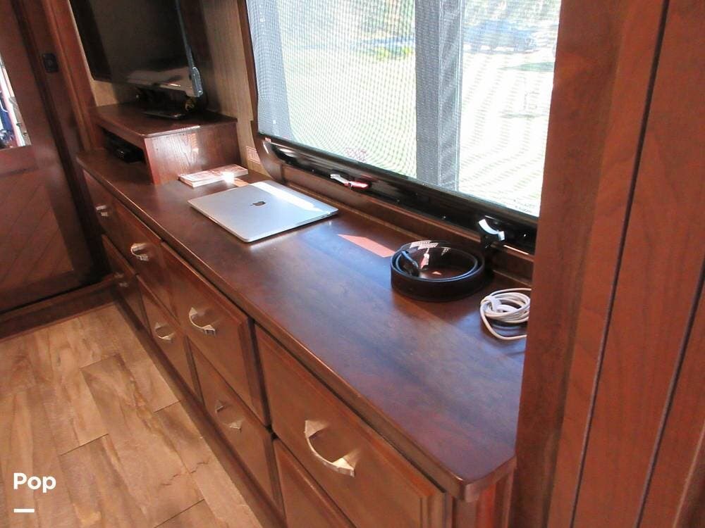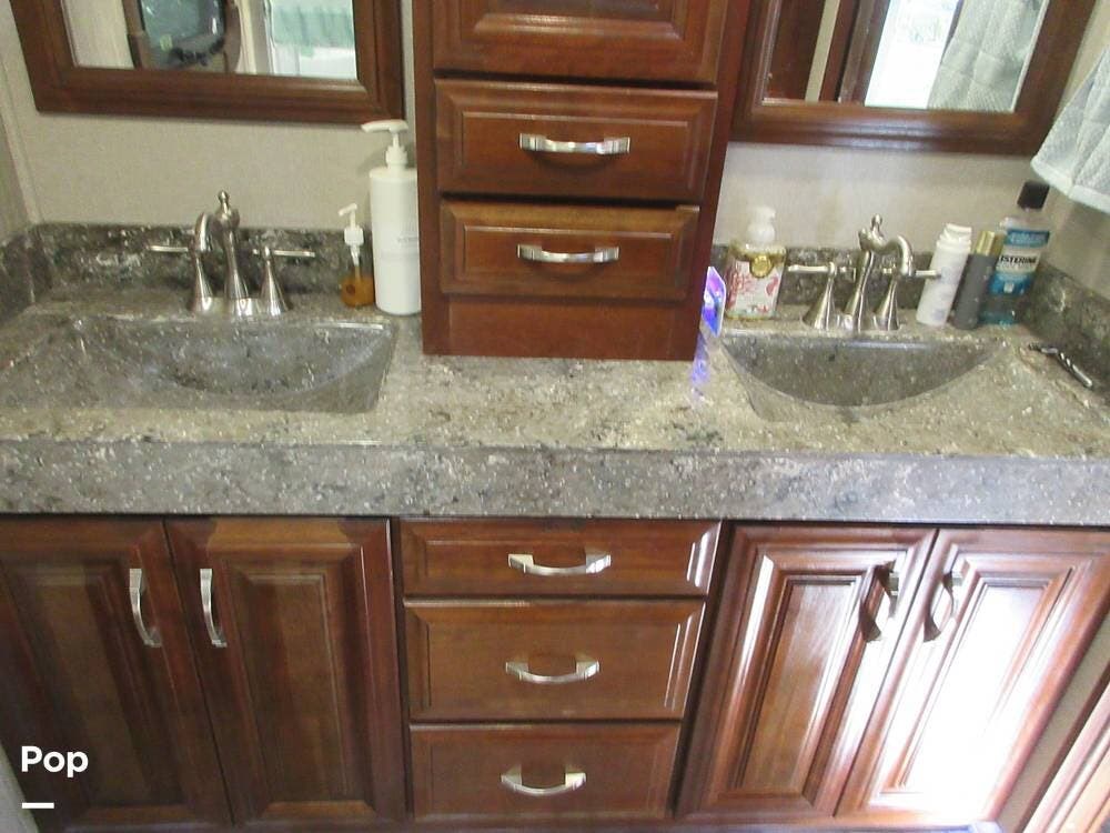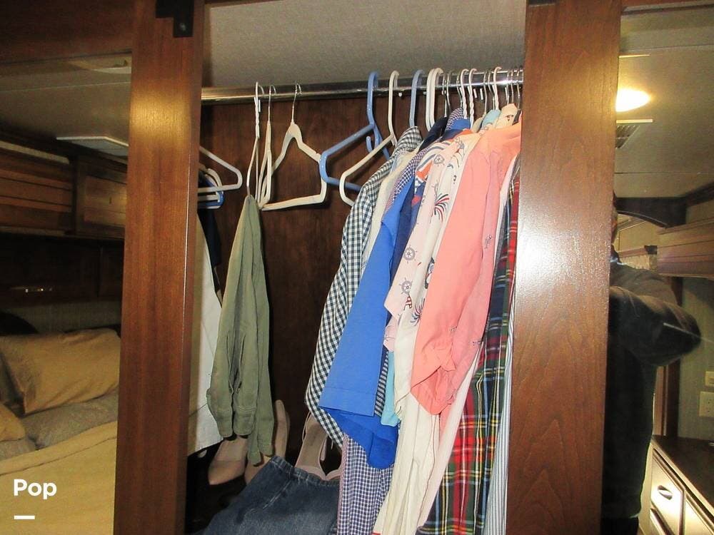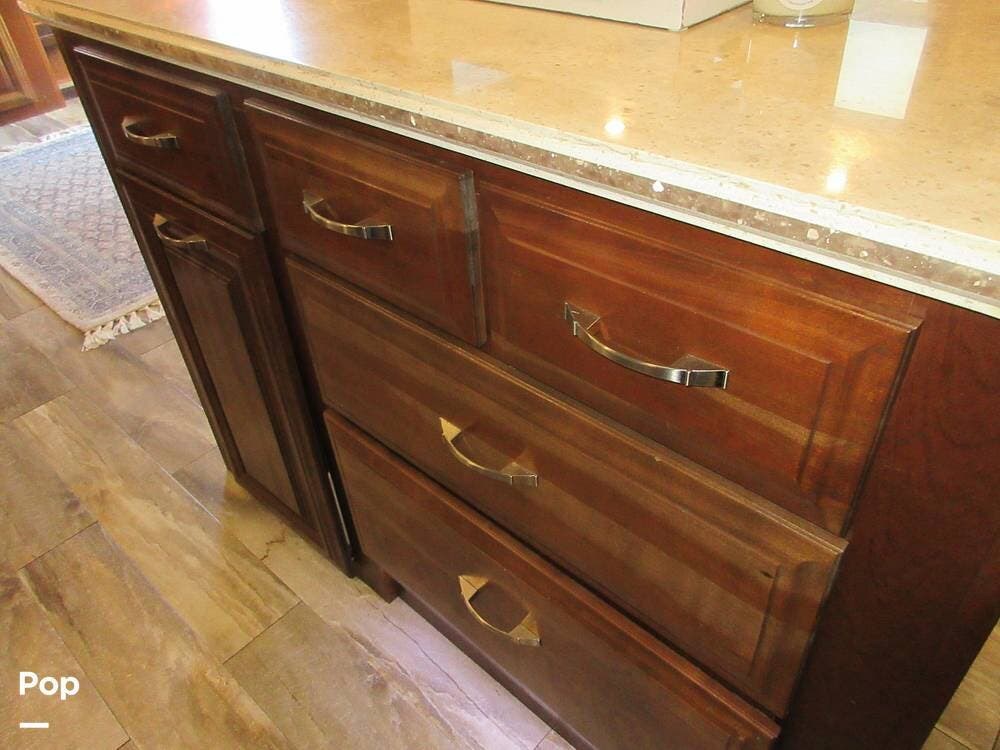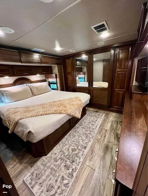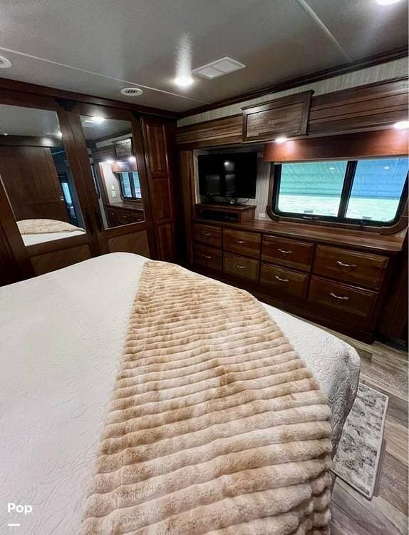 The master bedroom has a king-sized bed with a new mattress, a large dresser with eight soft-close drawers, plus overhead storage above the bed, and a TV. There is a large closet for hanging clothes and also pre-plumbed for a washer and dryer if so desired. This Mobile Suites is ready to get back "On The Road Again" now!