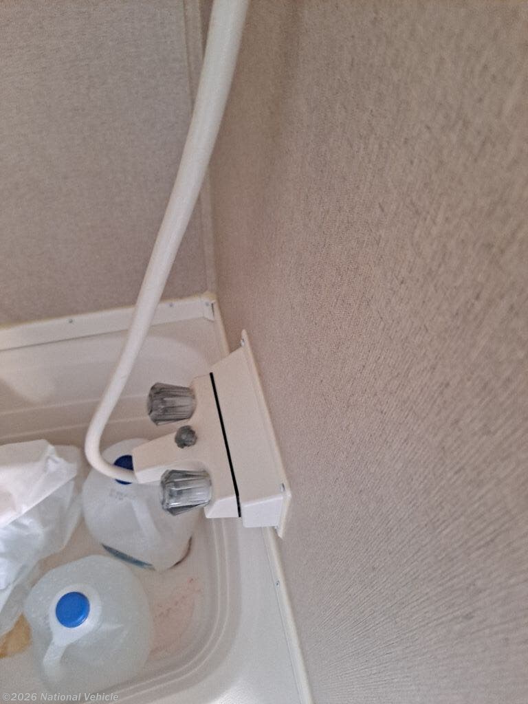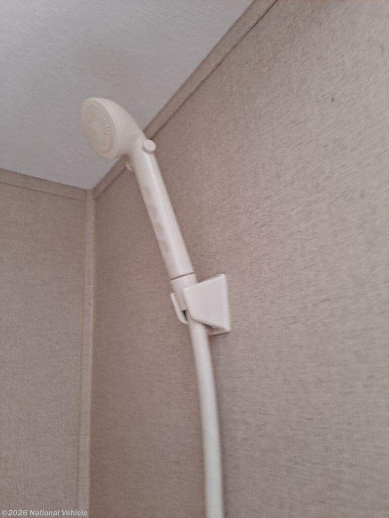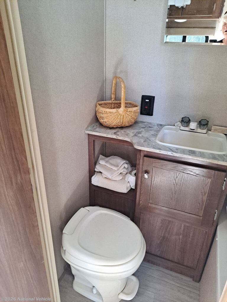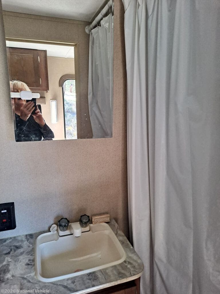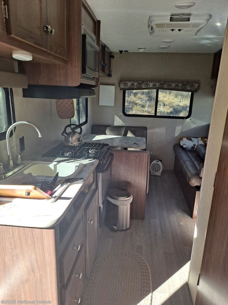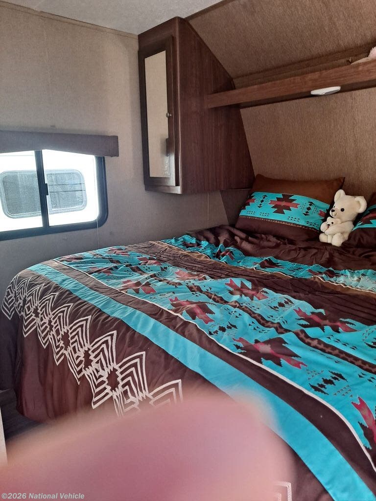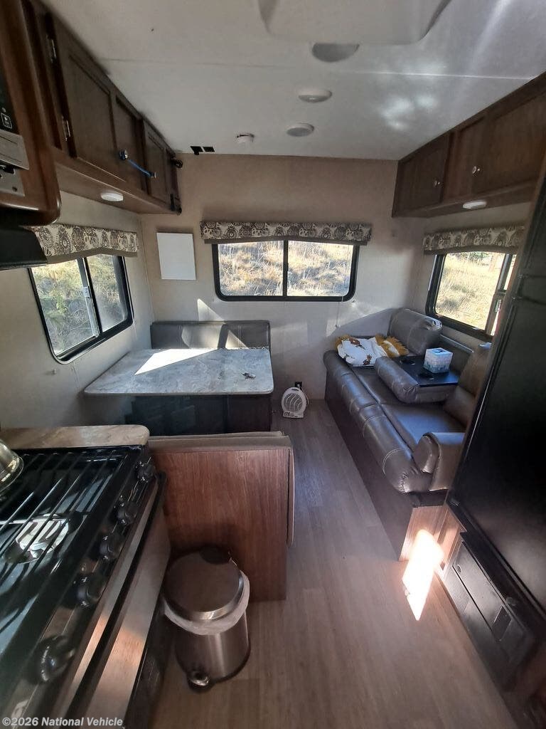 The layout is one of the most popular in this size, featuring a rear dinette with large windows and a front walk-around RV queen bed with a foam mattress topper for added comfort. The dinette and jackknife sofa both convert into beds, allowing sleeping for multiple guests. The full bathroom includes a vanity, sink, shower/tub combo, and vent fan.