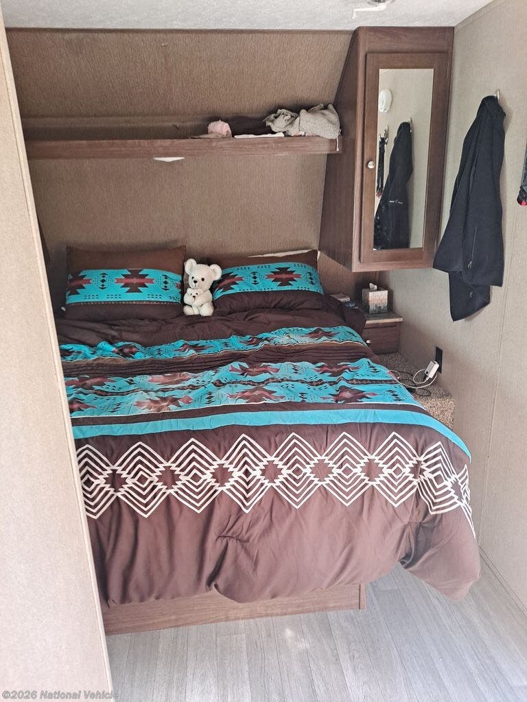 Additional features include manual stabilizer jacks, dual axle, gray vinyl plank flooring, and recently inspected brakes and axles for peace of mind.