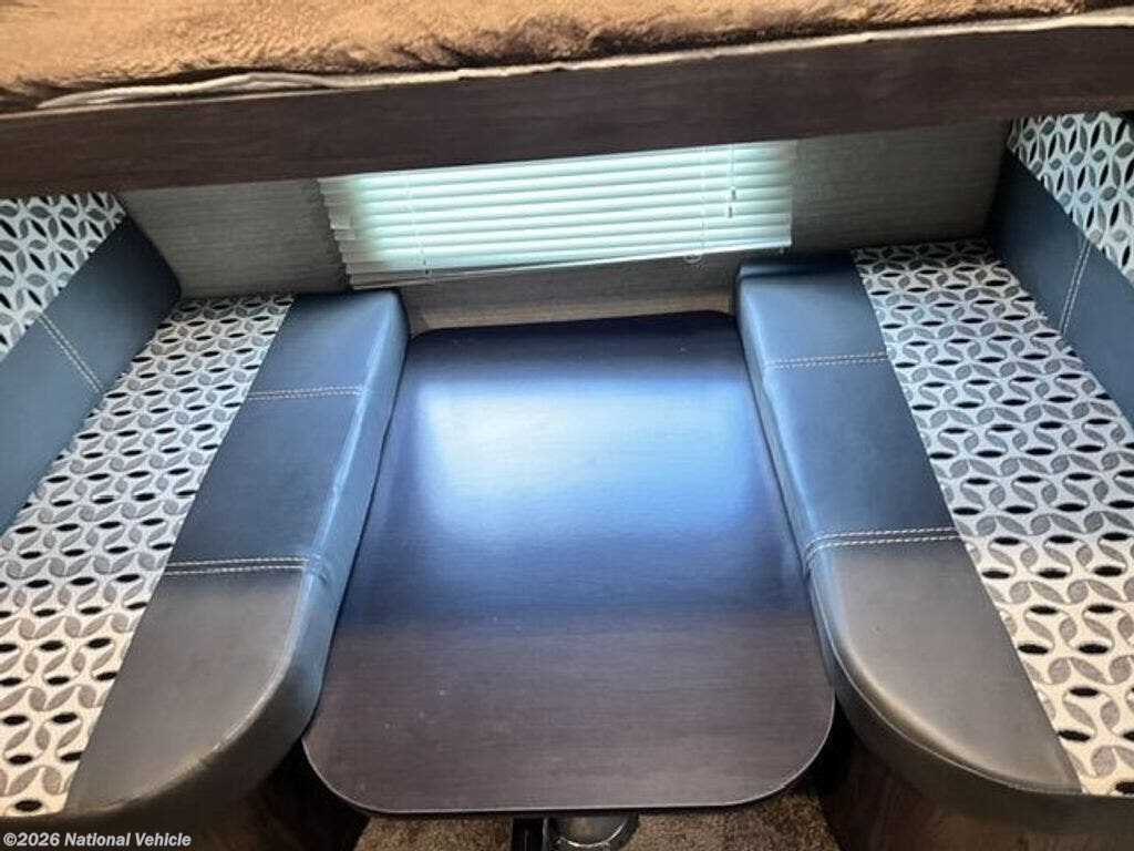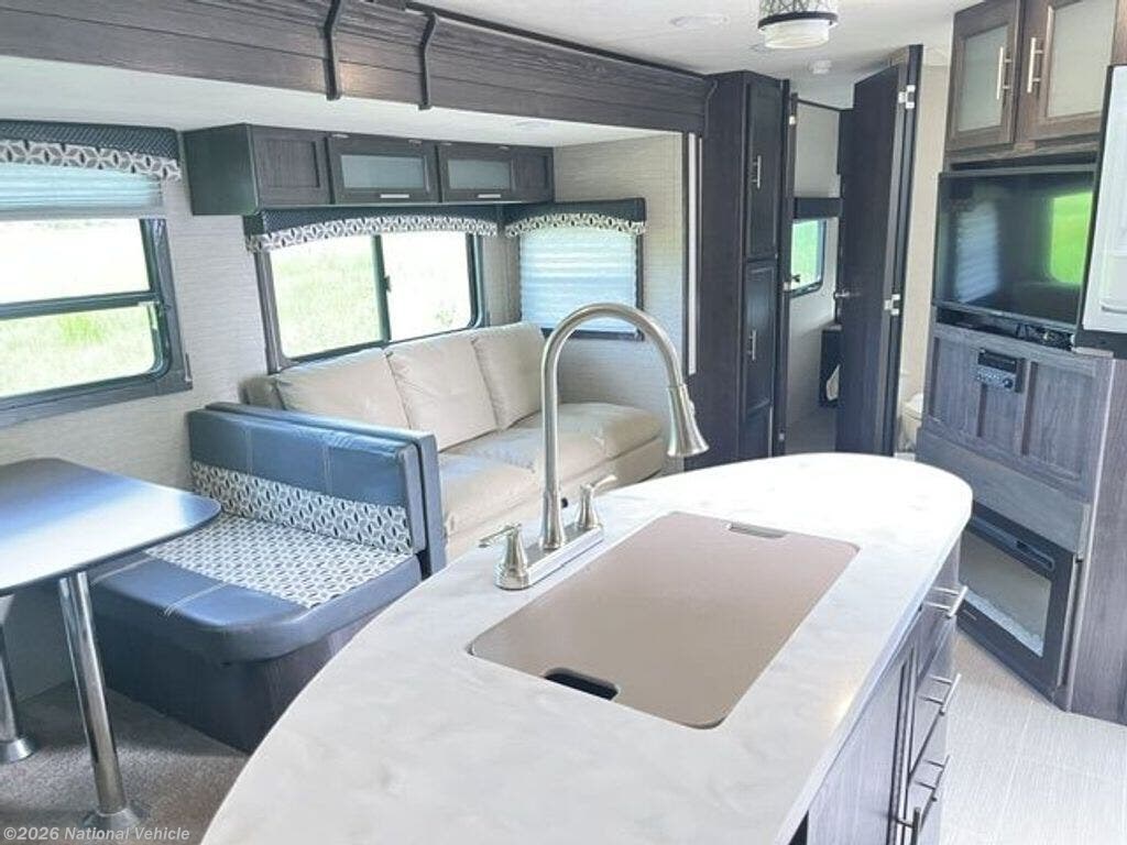 The main living area is bright and inviting, featuring comfortable seating, a booth dinette, and an entertainment center?ideal for relaxing after a day of adventure. The fully equipped kitchen includes a three-burner stove, oven, microwave, and refrigerator, along with plenty of counter space for easy meal prep.