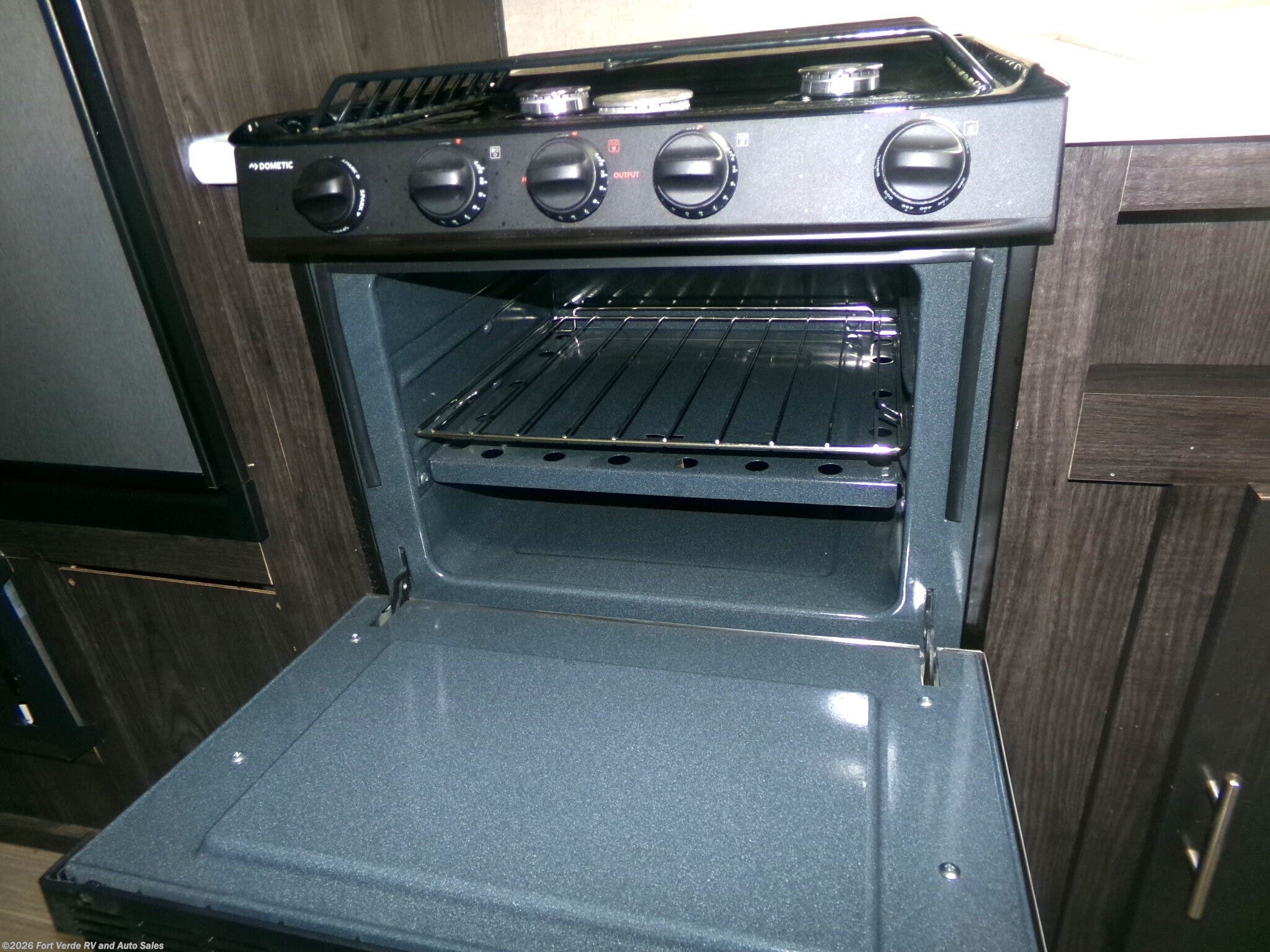 And, it has features you might not expect in this price range, like a powered tongue jack and a 14 foot powered awning. There are two propane tanks and two batteries!