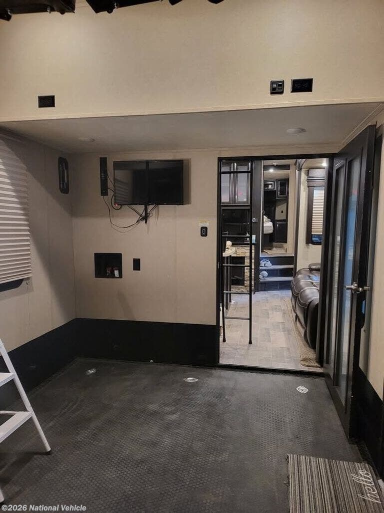 At the rear, the large garage area is built for versatility, featuring durable tie-downs, a ramp door that can convert into a patio, and an auxiliary fuel station to keep your toys ready for action. The garage also doubles as additional living or sleeping space with convertible seating and overhead bunks, making it perfect for guests or family members. There is also a Happi-Jac bed system, maximizing functionality in the space.