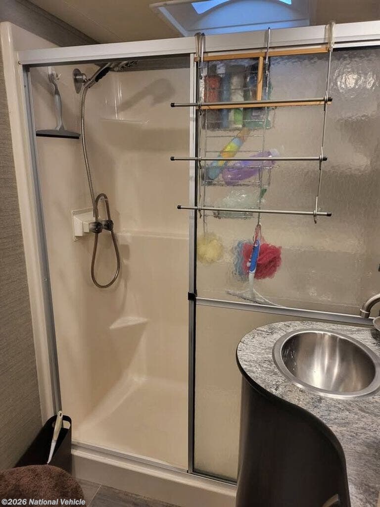 Up front, the private master suite includes a comfortable queen bed, wardrobe storage, and overhead cabinetry, creating a relaxing retreat after a day of adventure. The bathroom features a large glass-door shower, vanity, and ample storage, delivering the convenience and comfort of home wherever you travel.