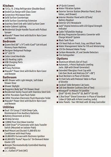 In addition to the standard Isata 3 features, this RV has three remote controlled ceiling fans, two 100 watt roof top solar panels with a 30 amp controller for keeping the batteries charged, auto 4 point hydraulic leveling jacks, Sumo Springs have been installed on front and rear suspension for improved handling, and new Michelin tires were installed at 25,000 miles.