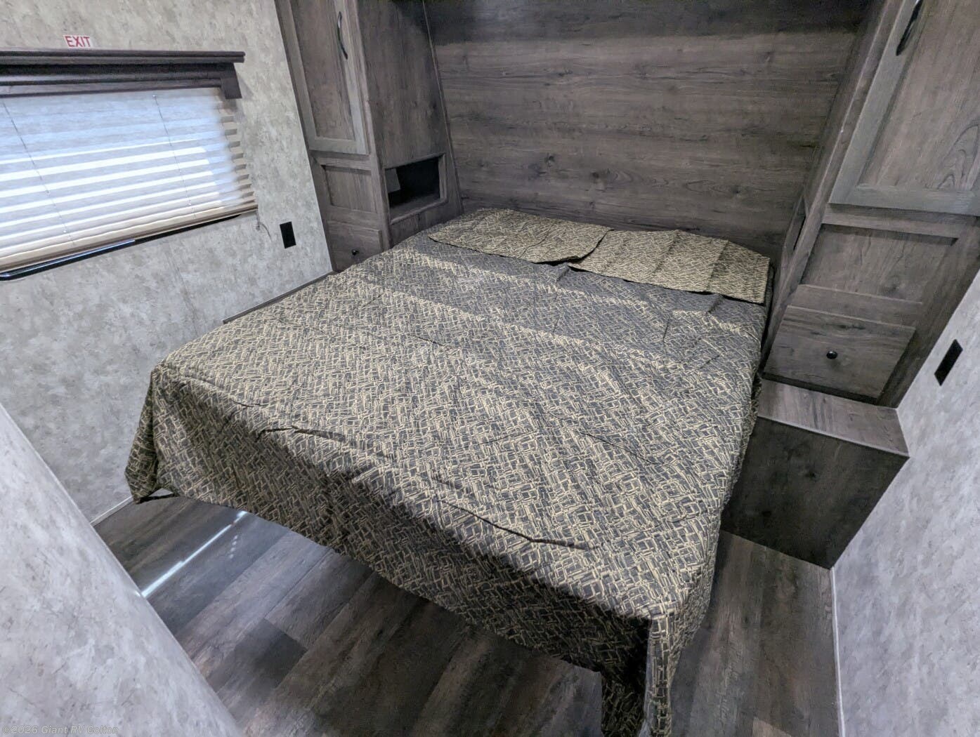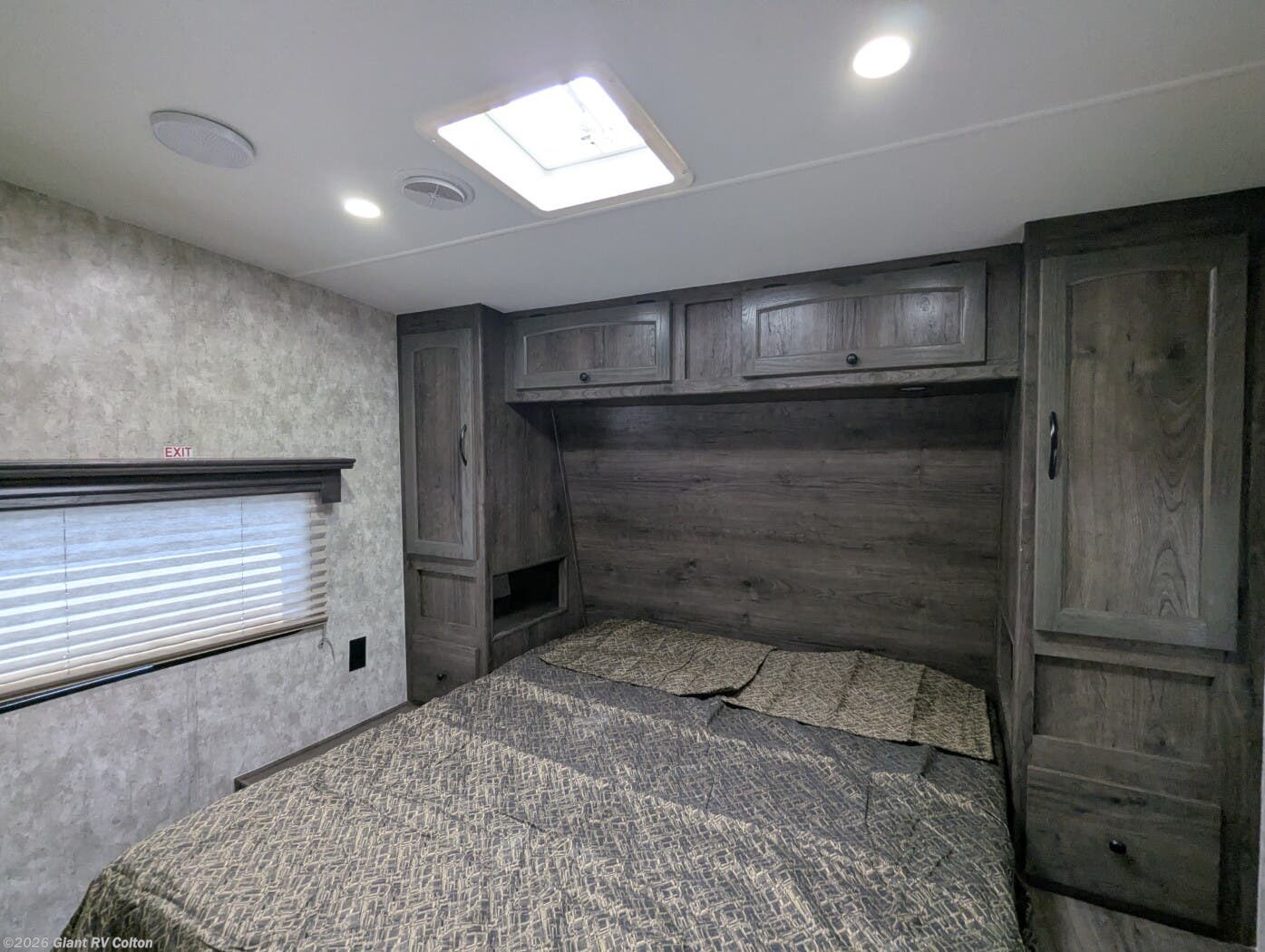 Front Queen Bedroom: Private front queen bed with wardrobe closets on both sides, overhead cabinets, and nightstands for a comfortable master suite feel separate from the garage area.