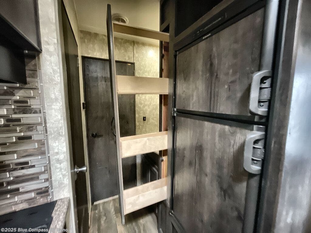 Heading toward the front of the trailer, you will find that the bathroom is a walk-through with a sink next to the refrigerator, and across the hall there is a door that closes off the rest of the bathroom which has a toilet and shower.