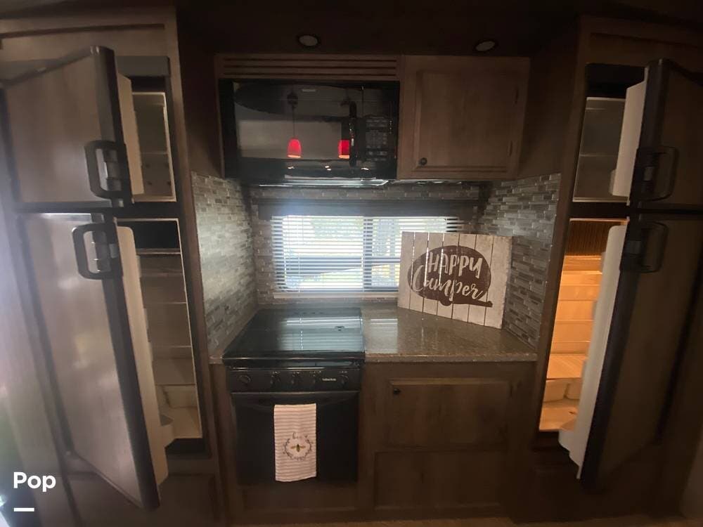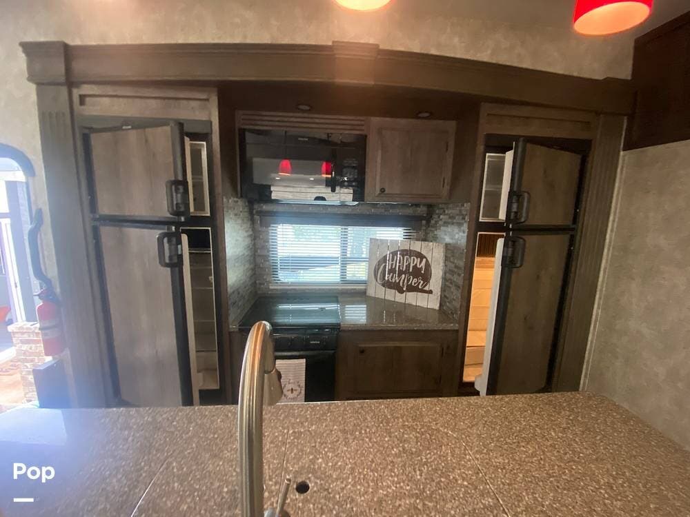The large island kitchen has a unique feature of two full-size refrigerators. There is a double sink in the island, an RV gas range, and plenty of storage.