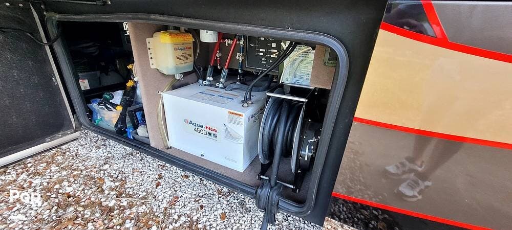 The coach has AquaHot for water heating. It has a solar panel with a controller for charging batteries.