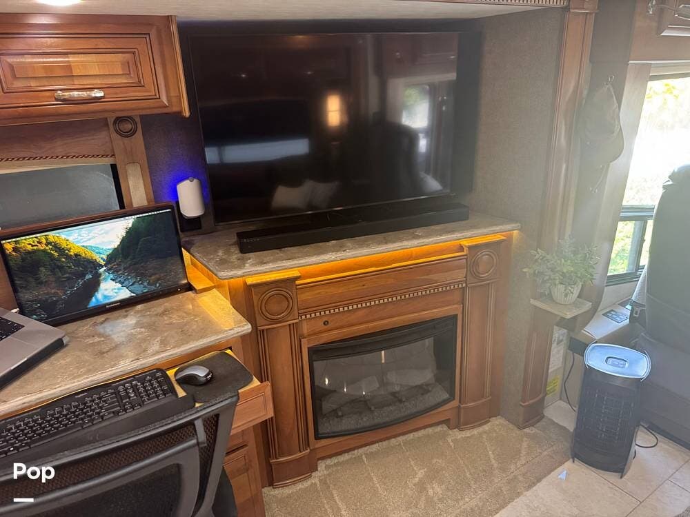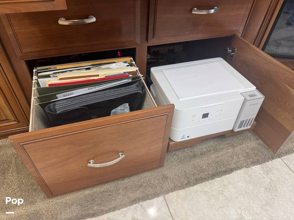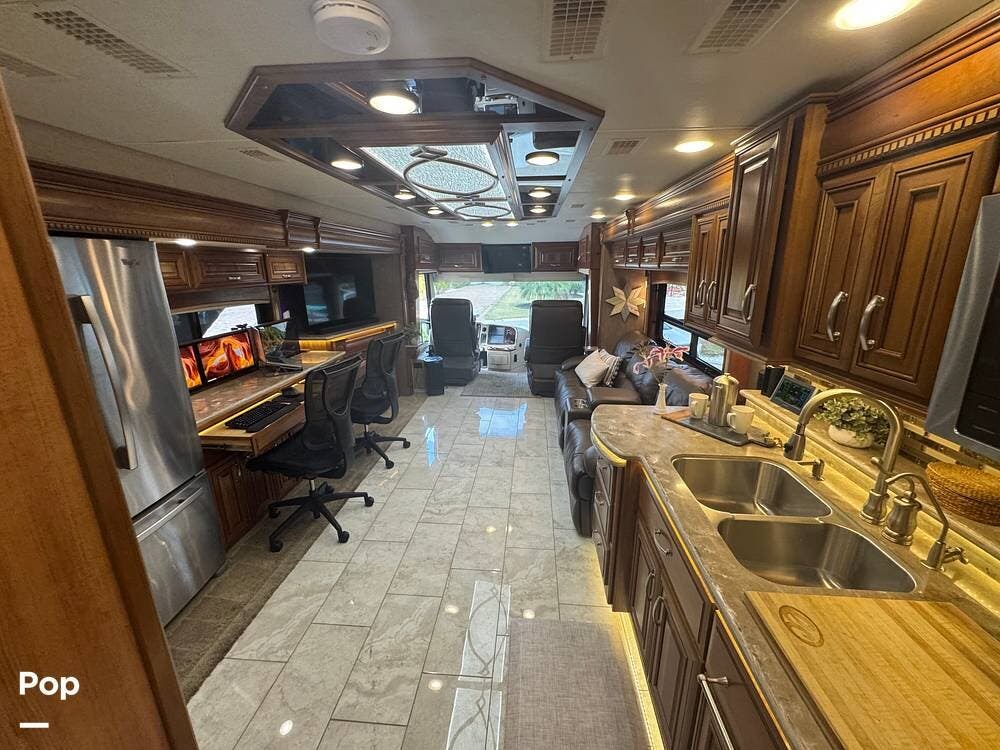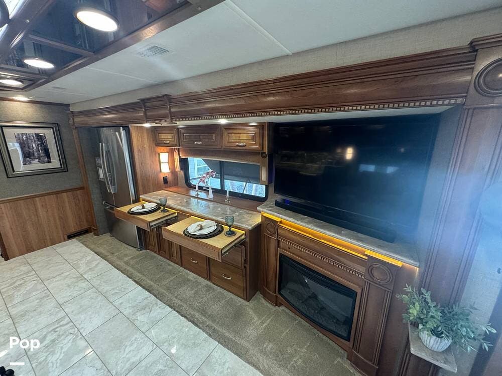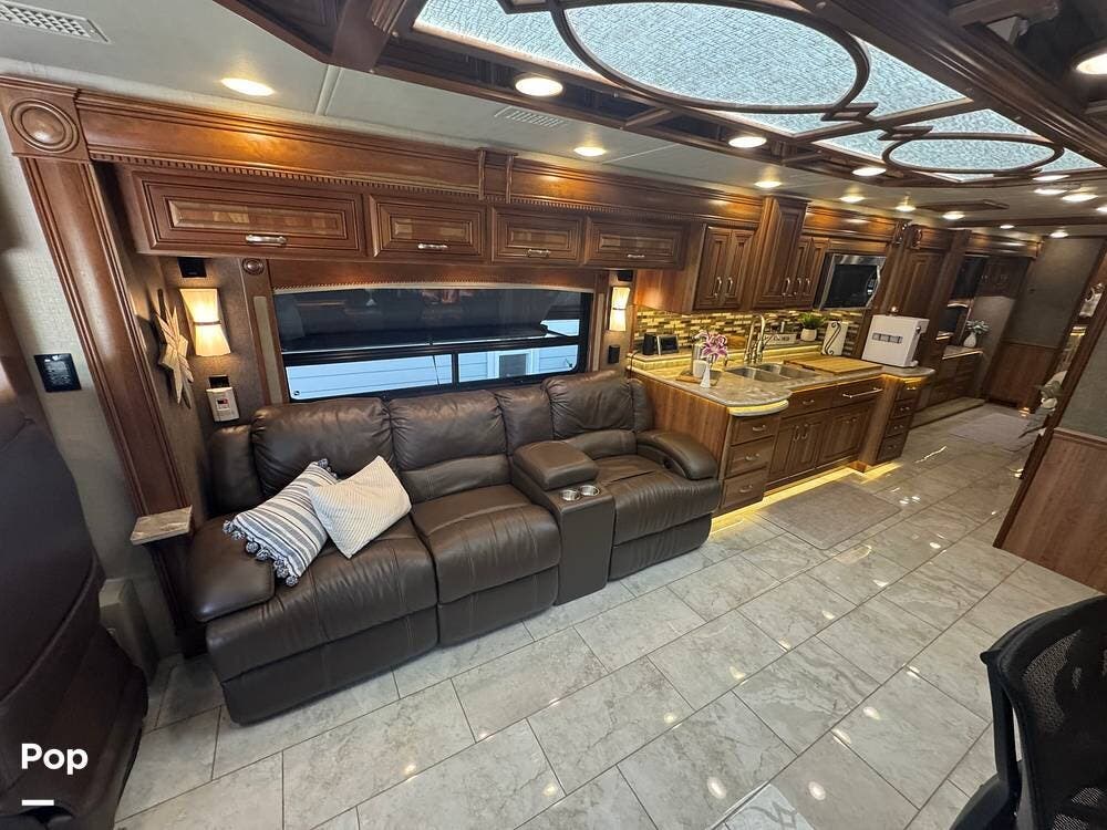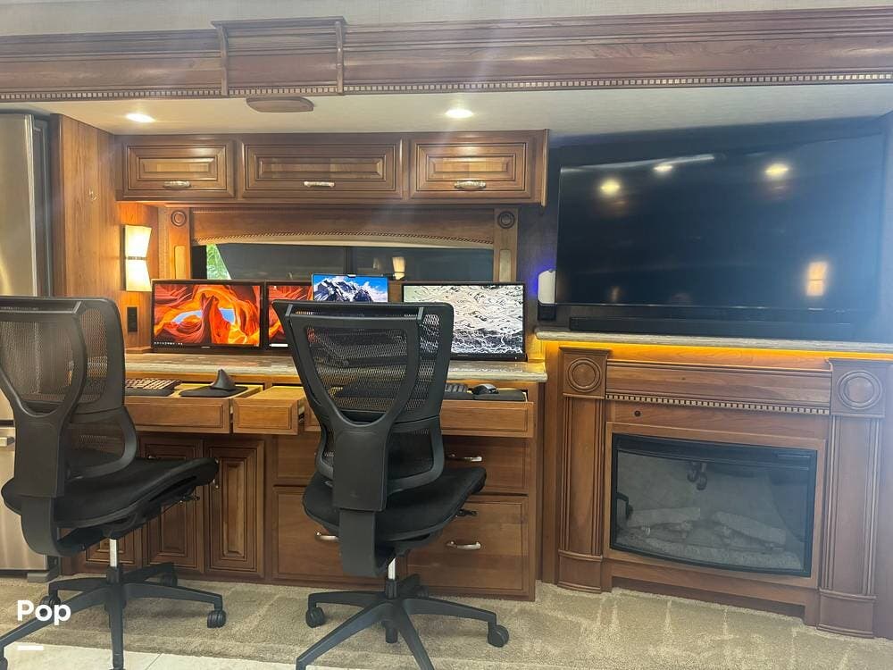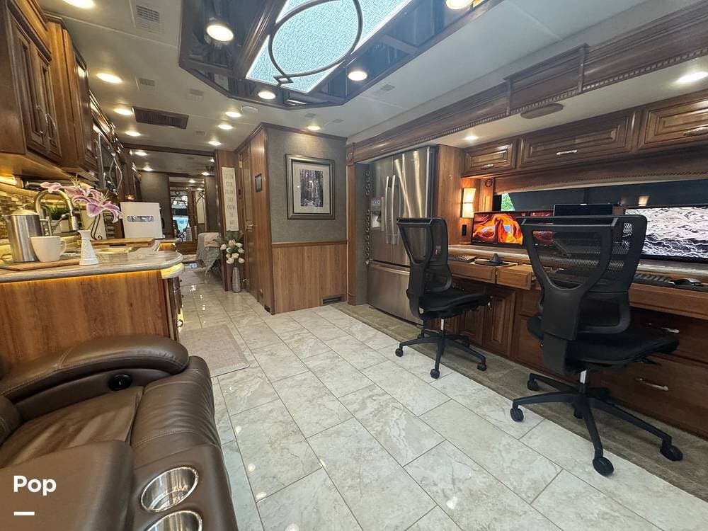 Inside, the 44B floorplan offers a perfect balance of residential luxury and functional design. High-end solid hardwood cabinetry, polished porcelain tile heated flooring, and premium furnishings create a warm, upscale atmosphere. There is ample storage everywhere inside the coach. The expansive living area features theater seating, a fireplace, and a large LED TV with surround sound, making it ideal for relaxing evenings or entertaining guests.