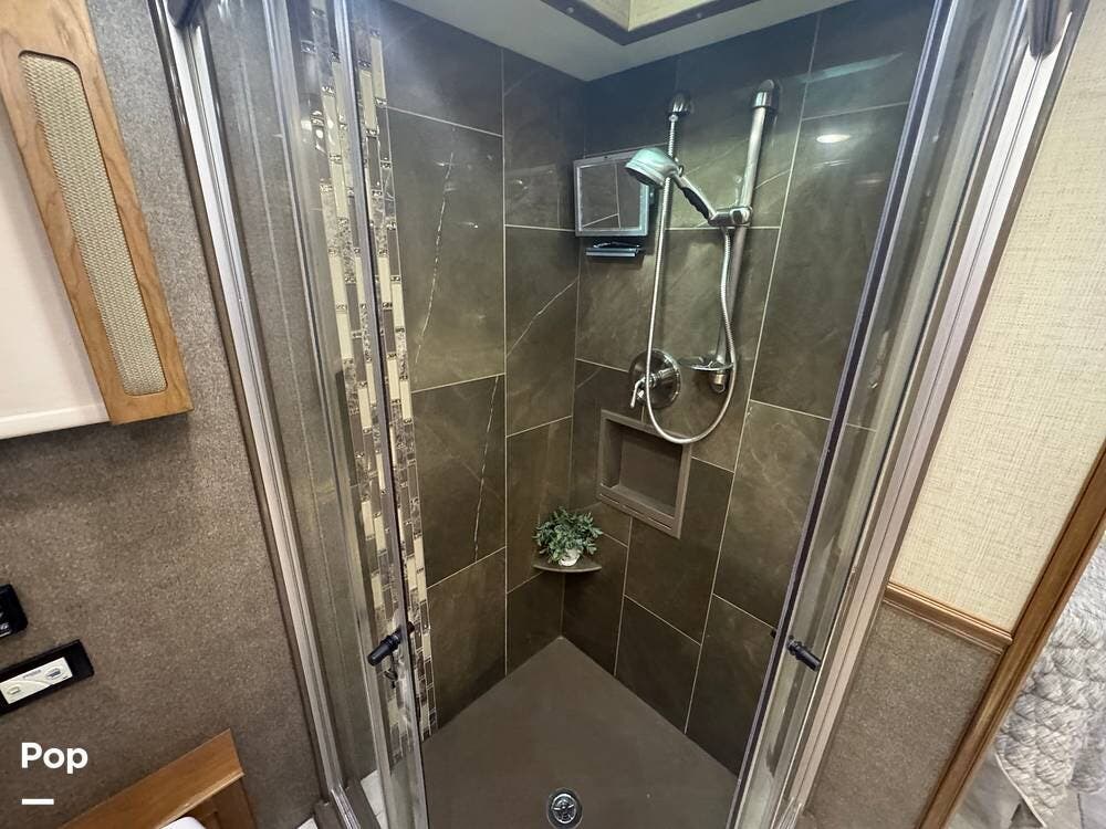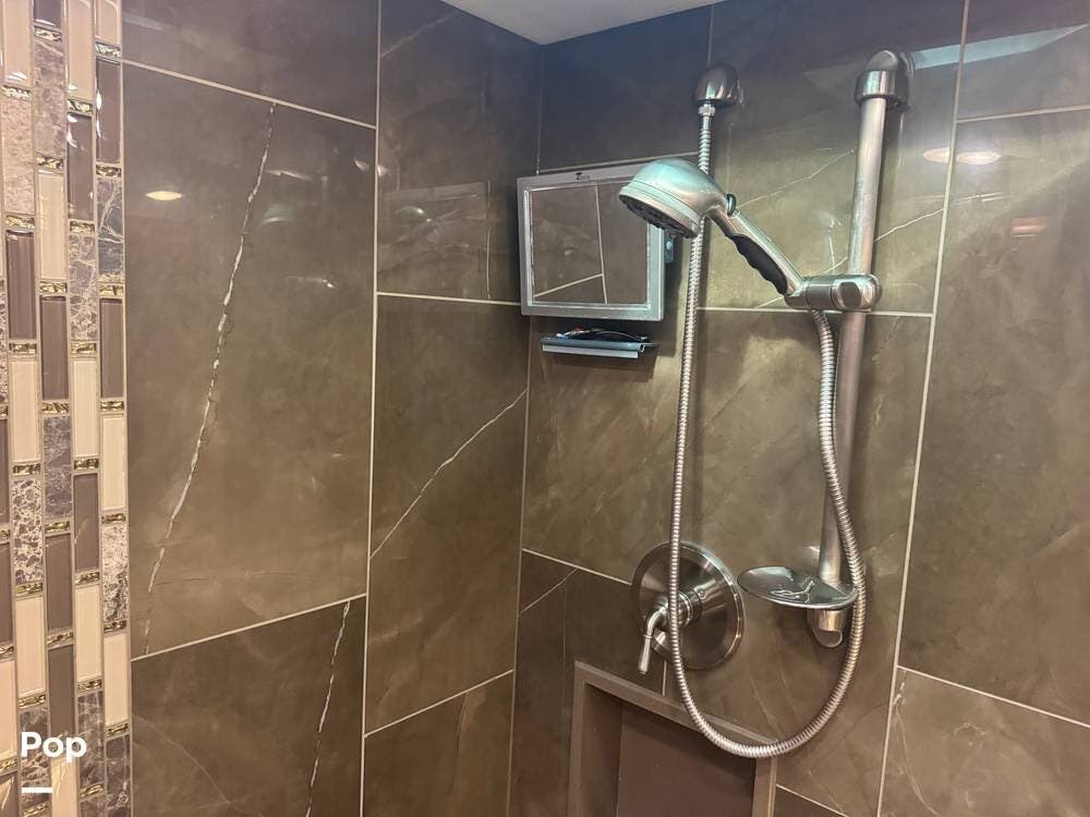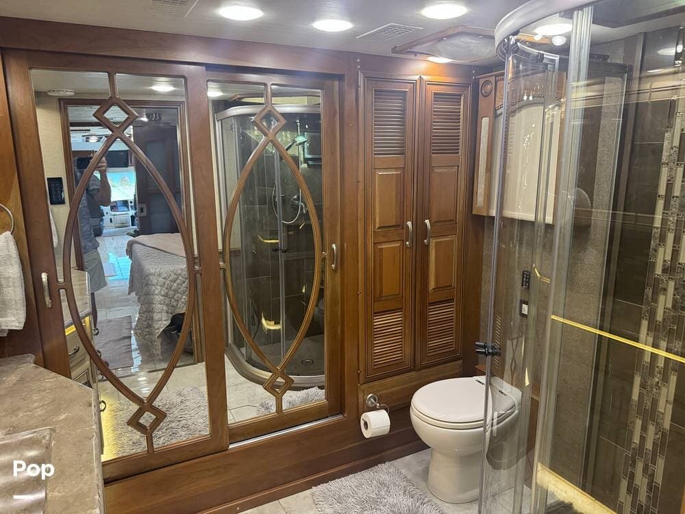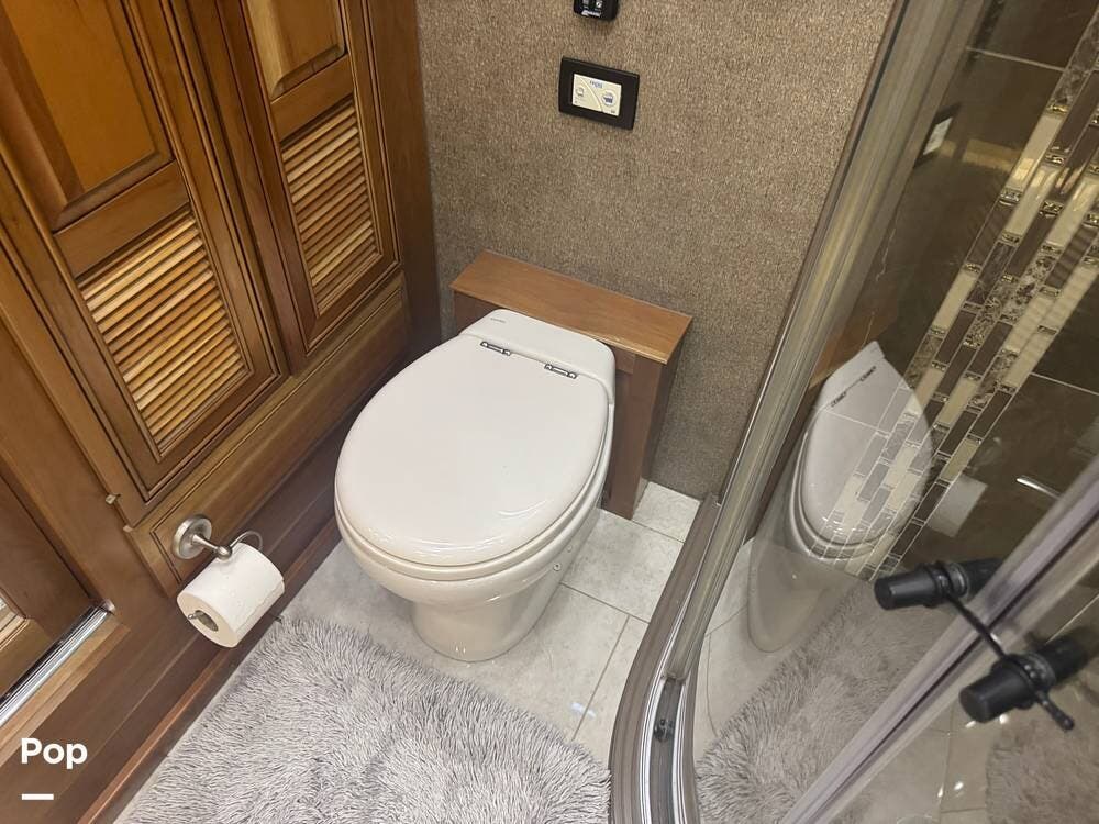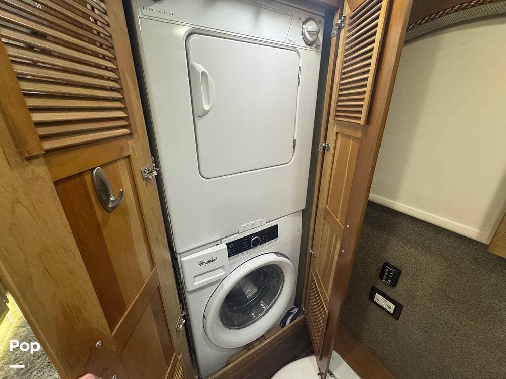 Retreat to the rear master bedroom, featuring a king-size bed, ample wardrobe storage, a washer/dryer, and another LED TV. The spa-inspired bathroom features a large shower, high-quality fixtures, and elegant finishes, bringing the comforts of home wherever you travel. There's a second bathroom just before the bedroom entrance, so a bathroom is accessible even when you want privacy in the bedroom area.