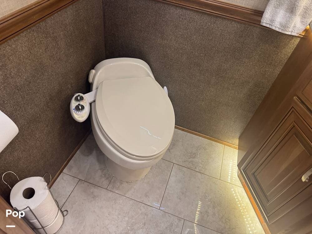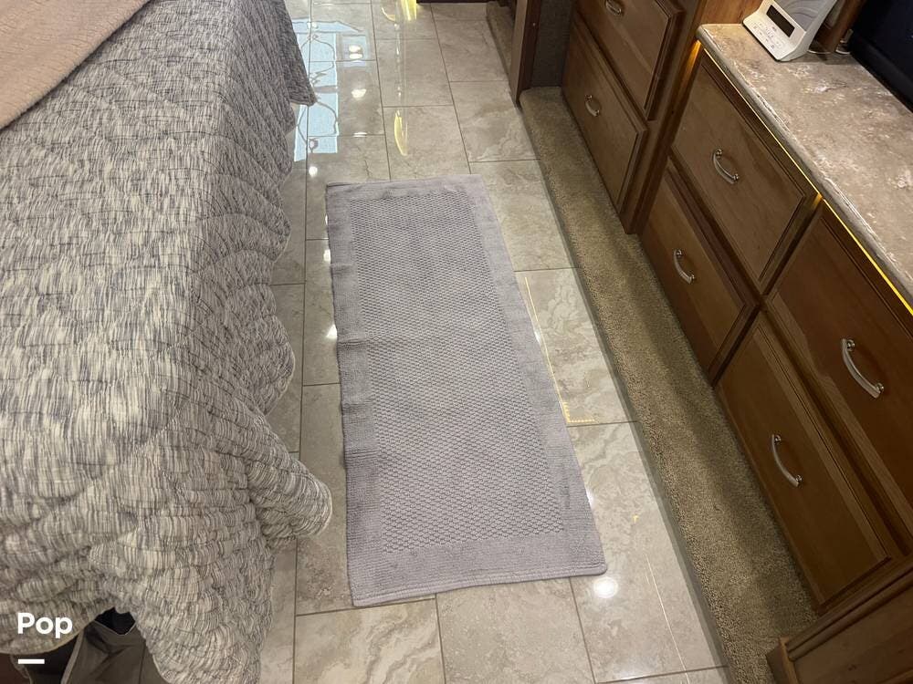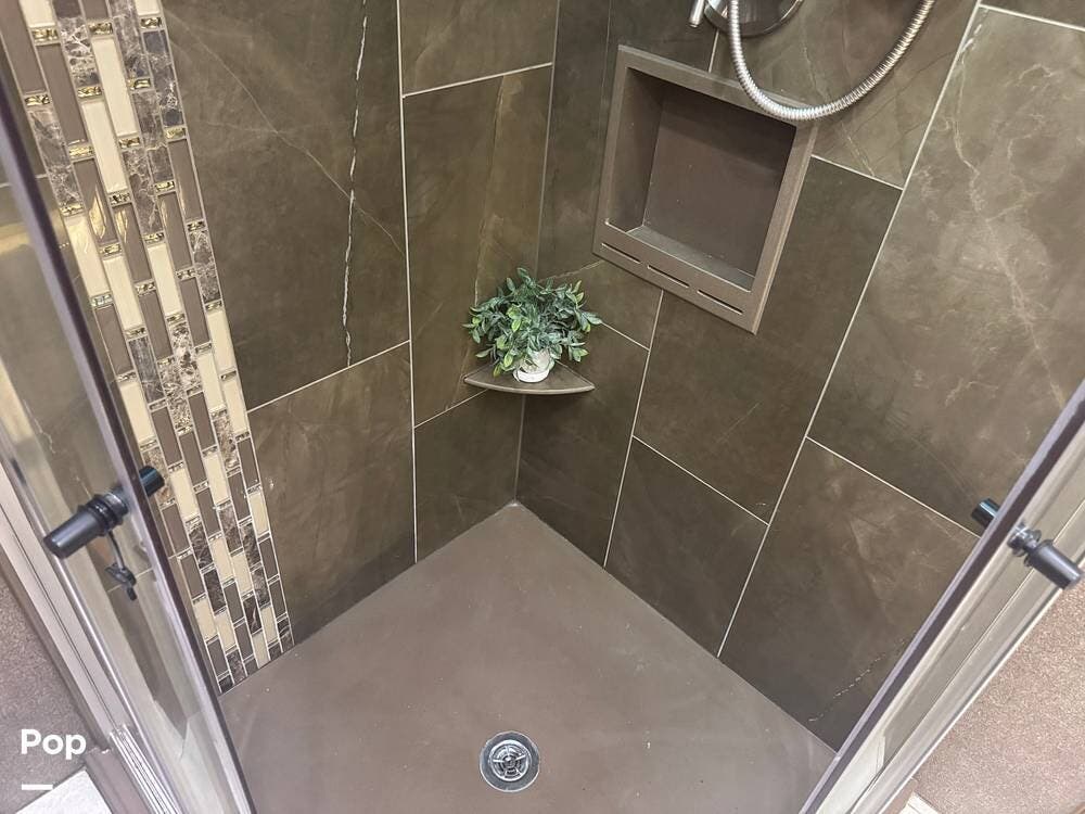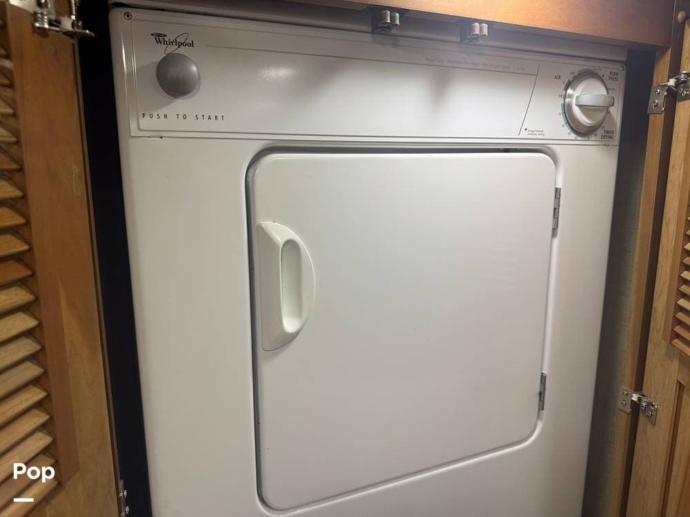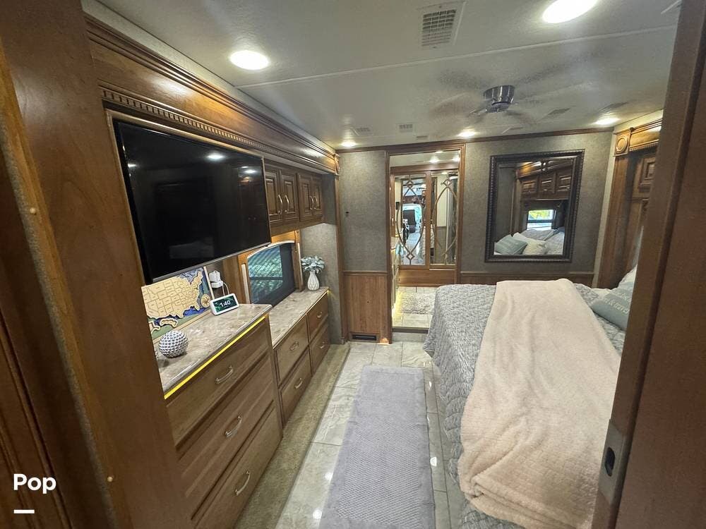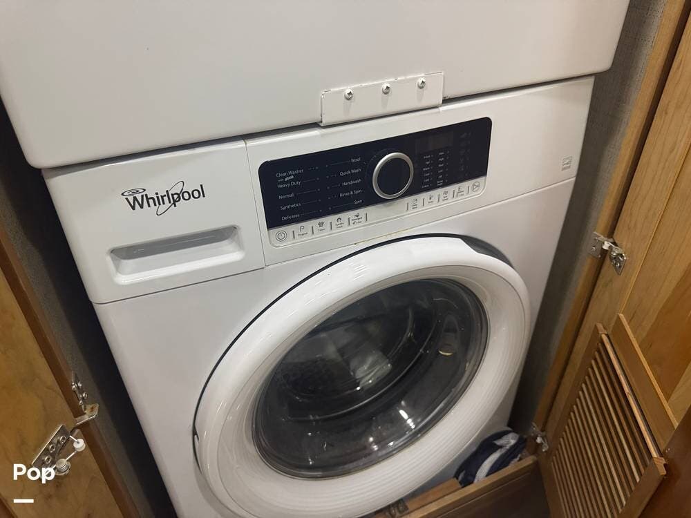 Retreat to the rear master bedroom, featuring a king-size bed, ample wardrobe storage, a washer/dryer, and another LED TV. The spa-inspired bathroom features a large shower, high-quality fixtures, and elegant finishes, bringing the comforts of home wherever you travel. There's a second bathroom just before the bedroom entrance, so a bathroom is accessible even when you want privacy in the bedroom area.