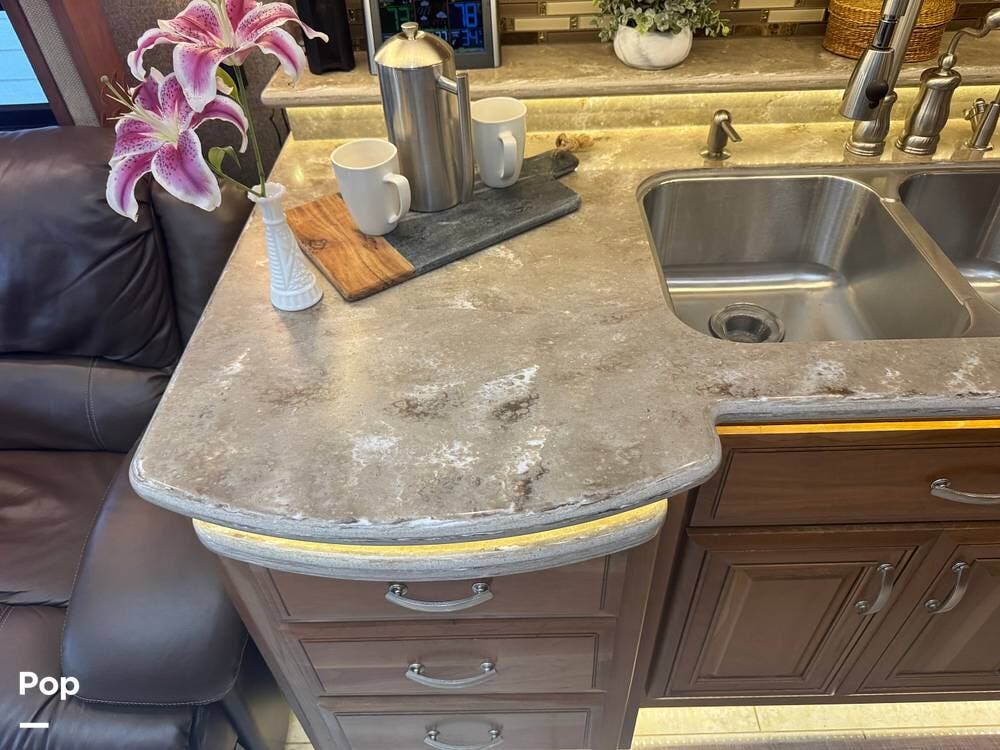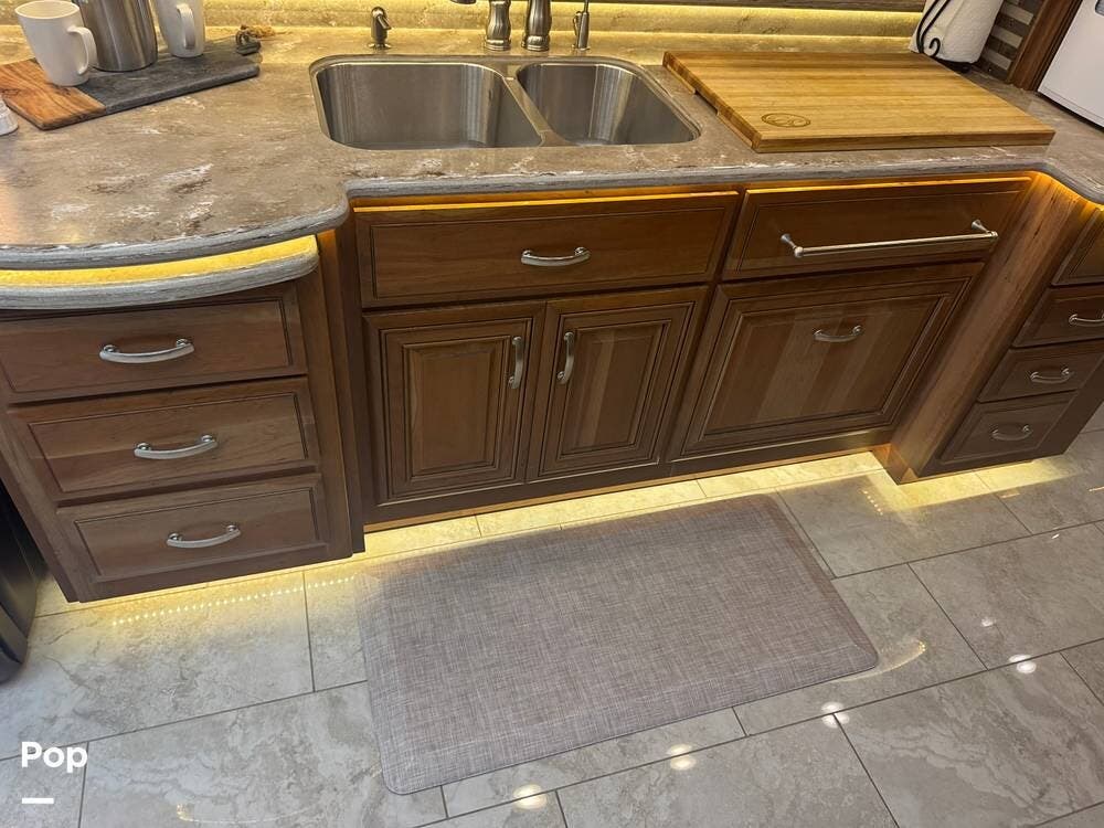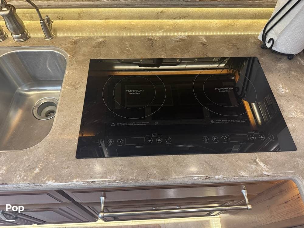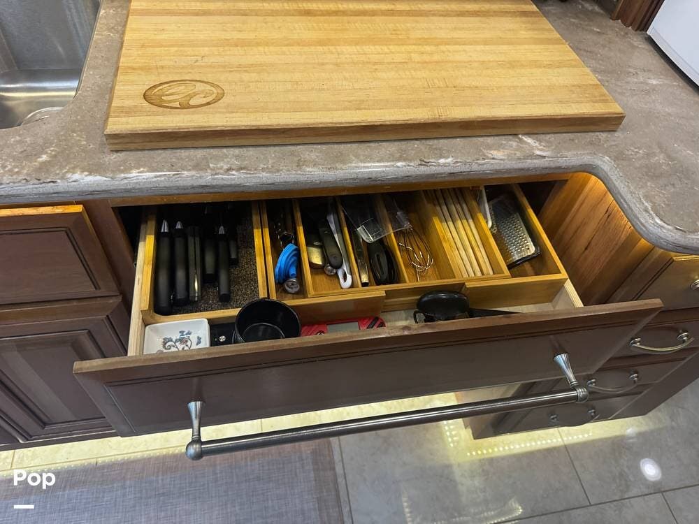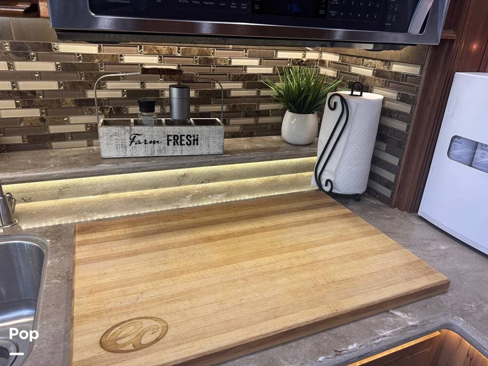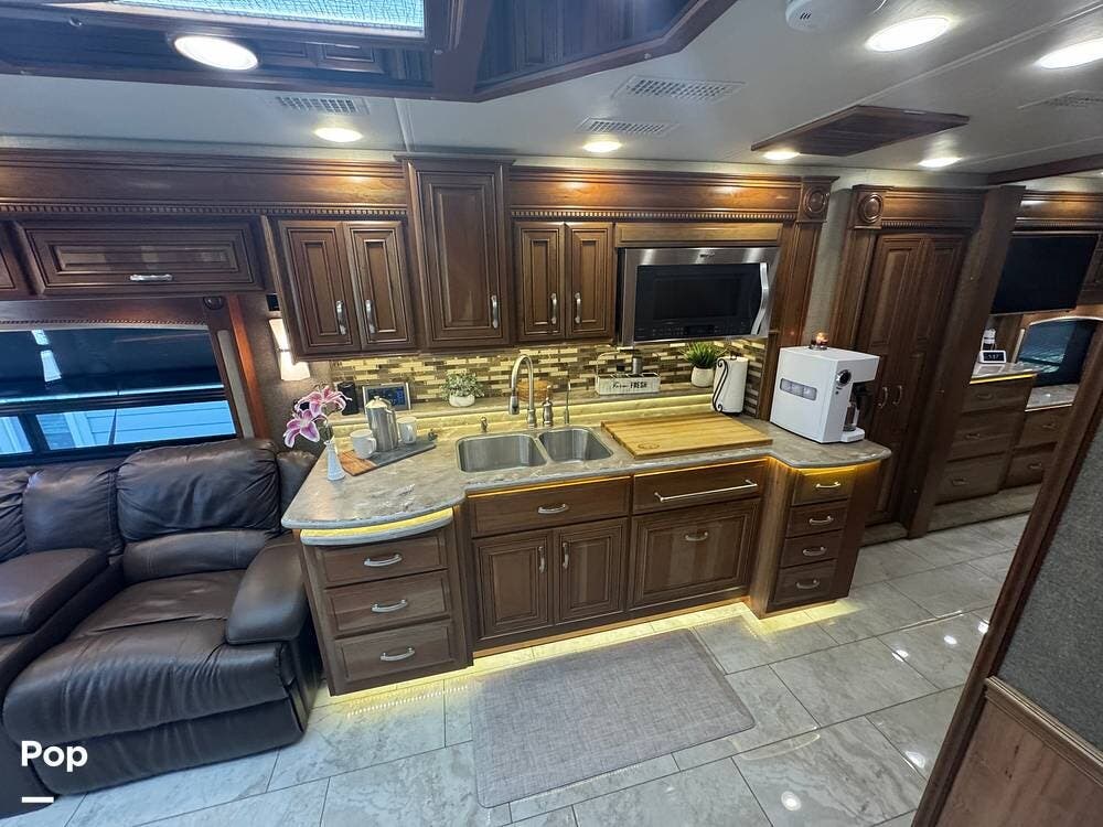 The gourmet kitchen is built for serious cooking, with solid-surface countertops, a residential refrigerator, an induction cooktop, a convection microwave, a dishwasher, Aqua Hot for instant hot water and abundant pantry space. Whether preparing a quick breakfast or a full dinner, you'll appreciate the thoughtful layout and upscale appliances.