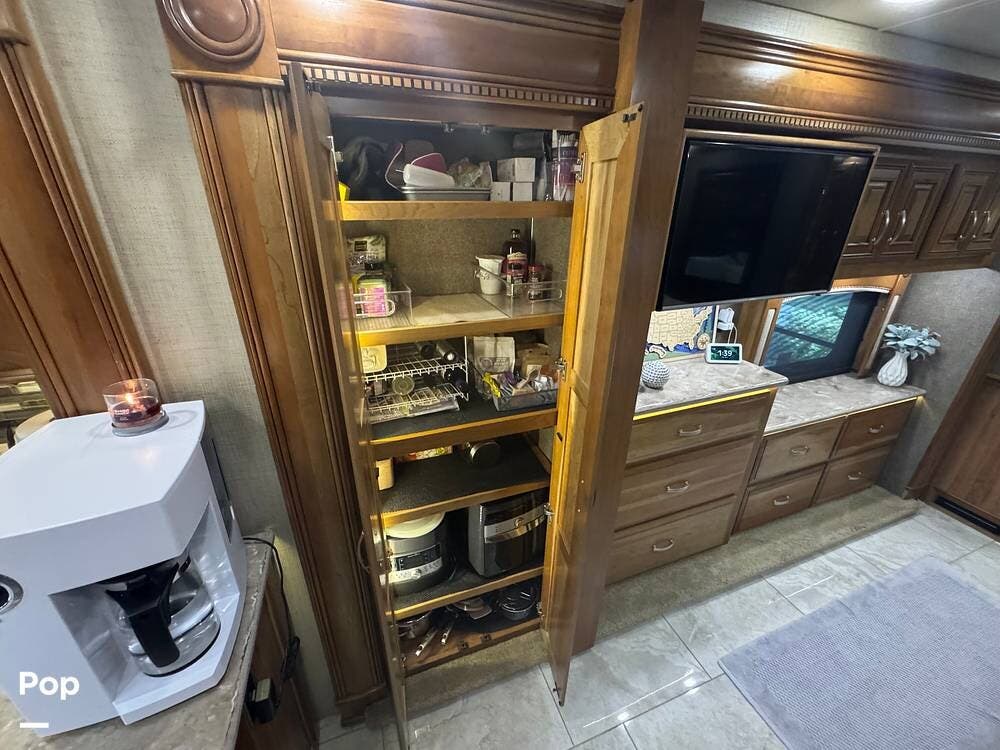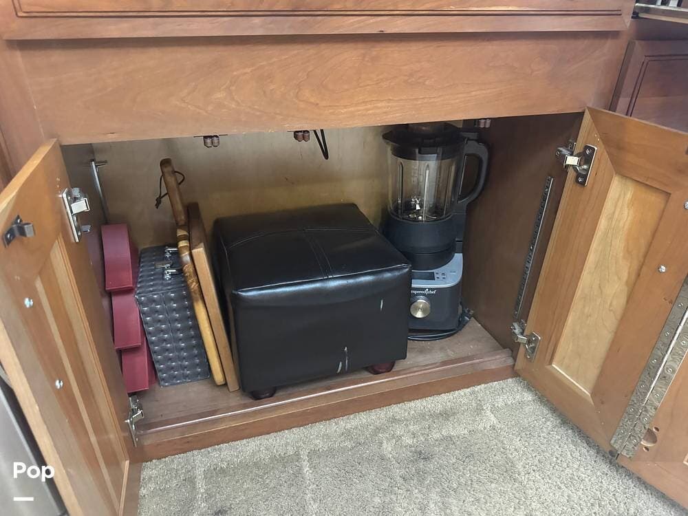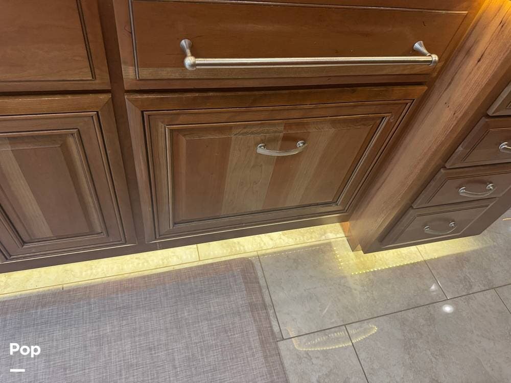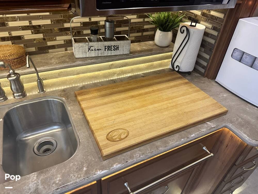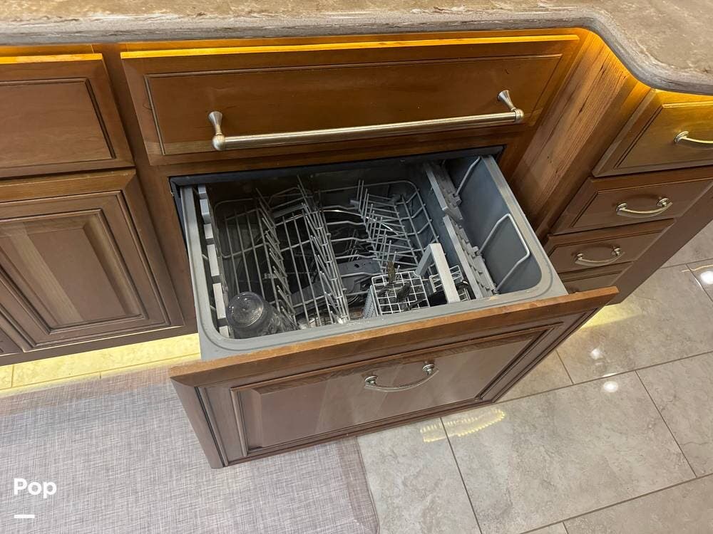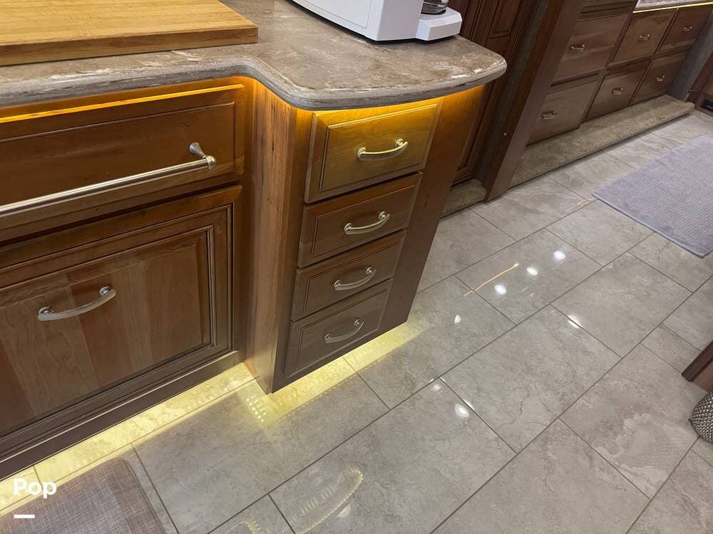 The gourmet kitchen is built for serious cooking, with solid-surface countertops, a residential refrigerator, an induction cooktop, a convection microwave, a dishwasher, Aqua Hot for instant hot water and abundant pantry space. Whether preparing a quick breakfast or a full dinner, you'll appreciate the thoughtful layout and upscale appliances.