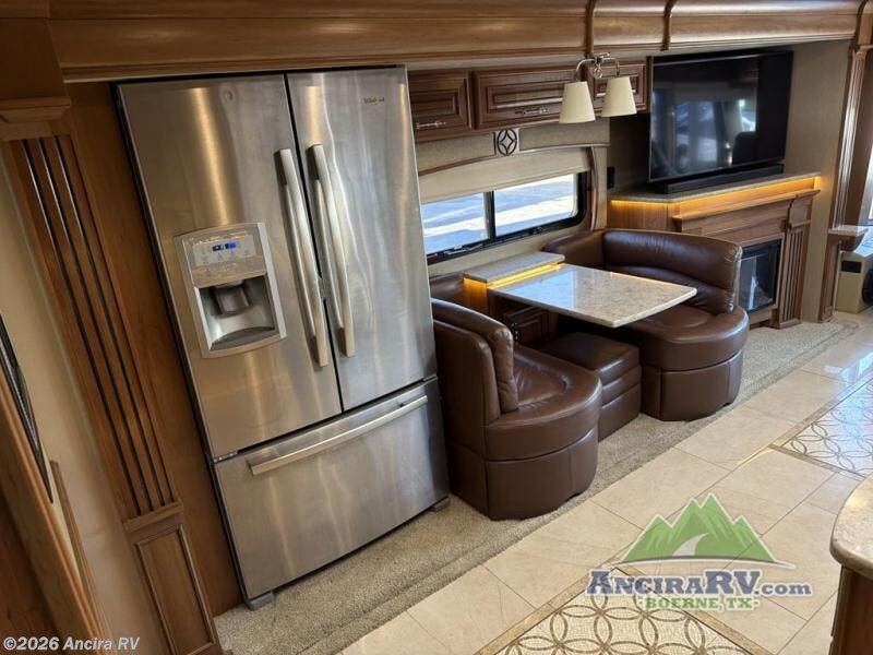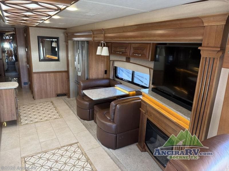On the passenger side of the motor home you will find a slide with a l-shaped sofa and two ottomans or you can choose a theater seat option featuring three power recliners. Also within the slide there is a double kitchen sink, two burner range, microwave, overhead cabinets, and a shelf. The opposite side offers a slide with an entertainment center, fireplace and a 50" TV, and a dinette with chairs, plus a refrigerator. You can choose a booth dinette if you like.