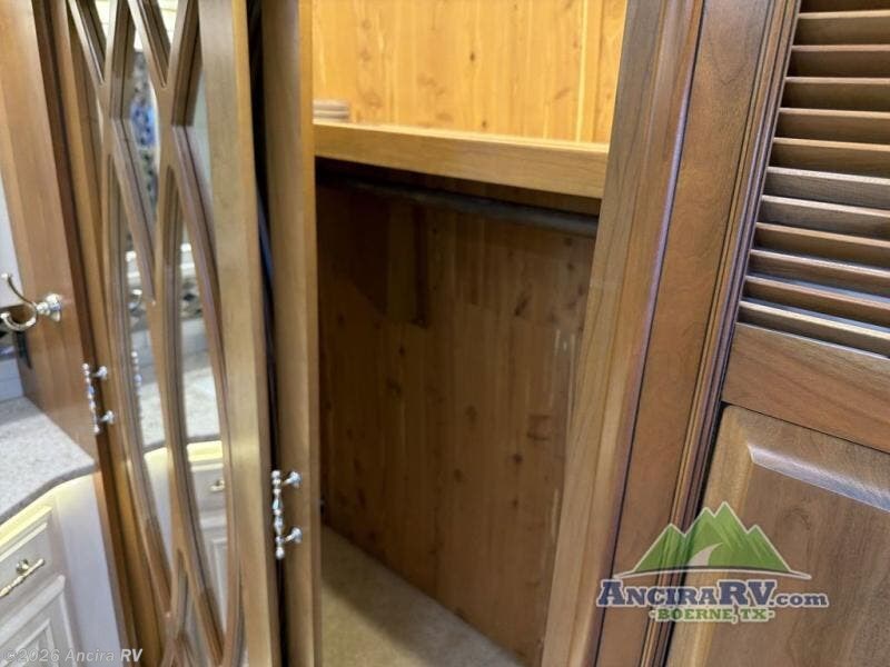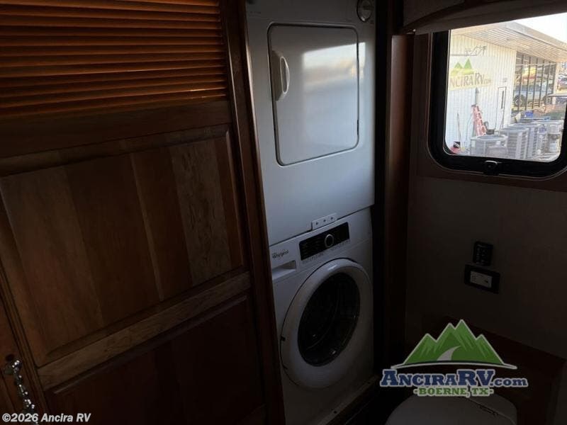 In the rear of the coach you will enjoy your own master bath featuring a vanity with DUAL sinks on one side, plus a shower and toilet on the opposite side. Along the rear wall you will find a wardrobe with sliding mirror doors and a washer and dryer.
