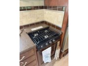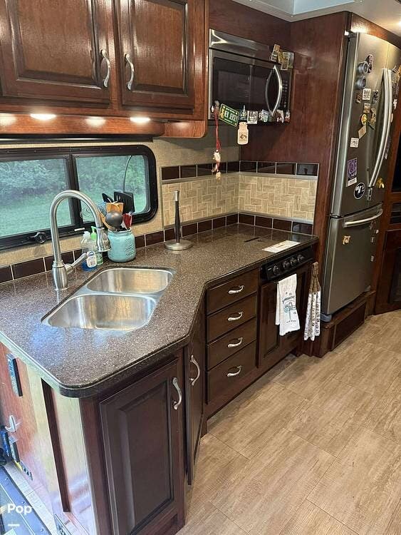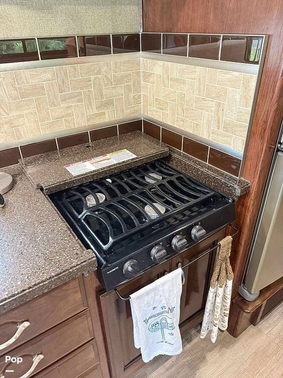 The fully equipped kitchen offers solid surface countertops, a residential-style refrigerator, a three-burner stovetop, and a convection microwave, perfect for preparing meals on the go.