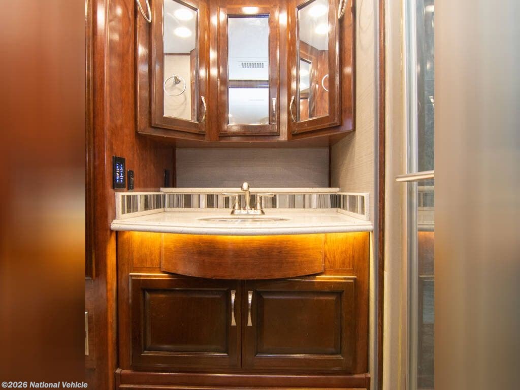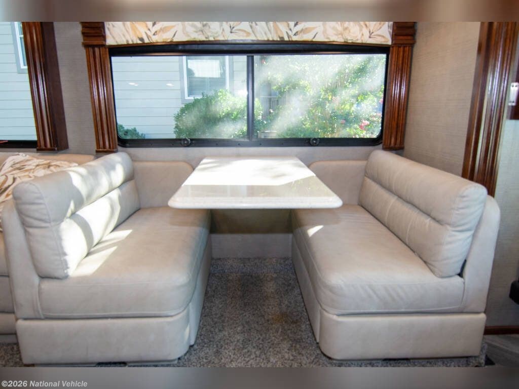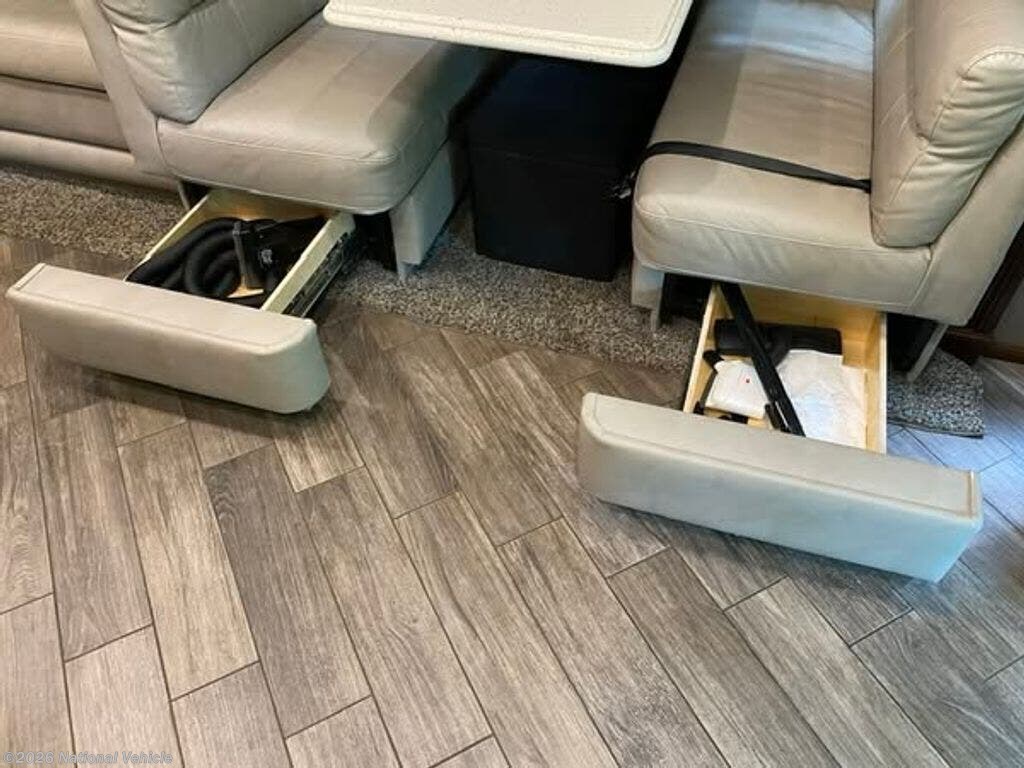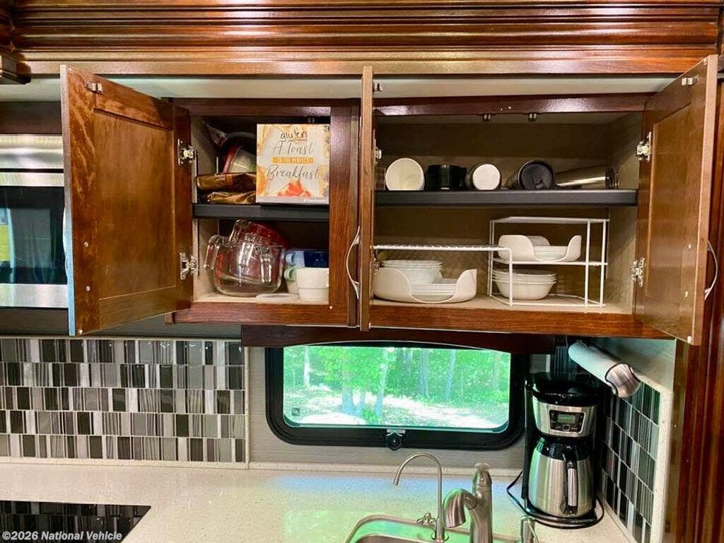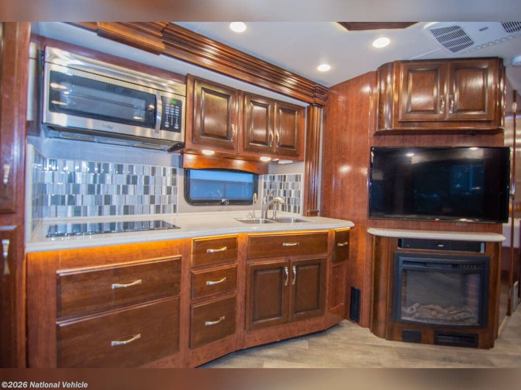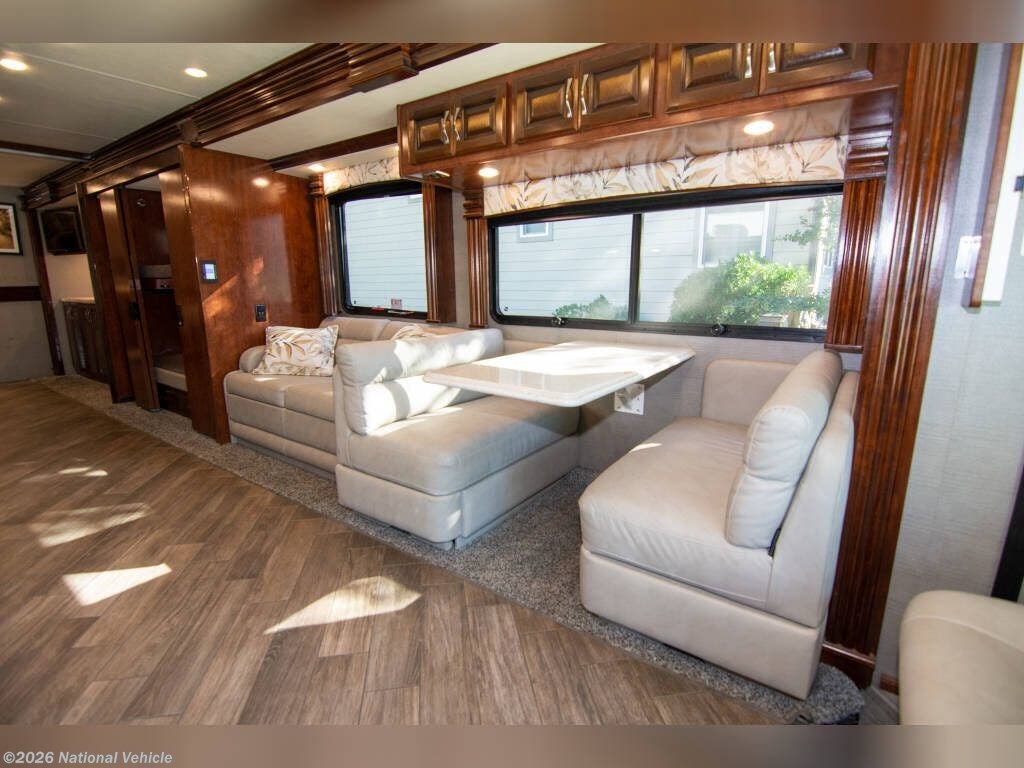 The heart of the 38N is its thoughtfully crafted living space. A plush seating area, entertainment system, and generous cabinetry create an inviting environment perfect for relaxing or hosting guests. The fully equipped kitchen features solid-surface countertops, a residential refrigerator, convection microwave, stovetop, and abundant storage, giving you all the tools needed to enjoy home-cooked meals on the road. Opposing slides create an open-concept feel, and high-end finishes add a touch of luxury throughout.