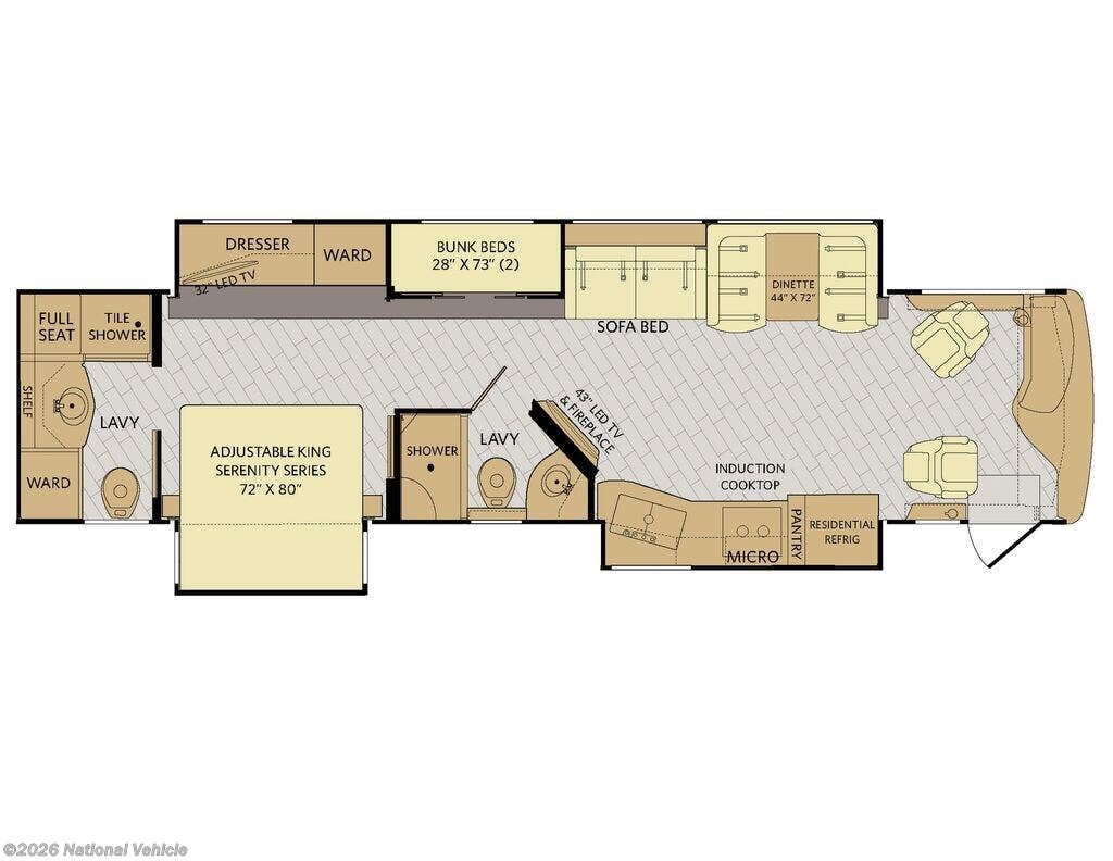 Families love the 38N?s dedicated bunkhouse, making this one of Discovery?s most family-friendly floorplans. In addition to the bunks, the private master suite offers a serene retreat with a walk-around king bed, wardrobe space, and its own TV. The spacious bathroom features a large shower, vanity, and quality fixtures, providing everyday convenience wherever your travels take you.