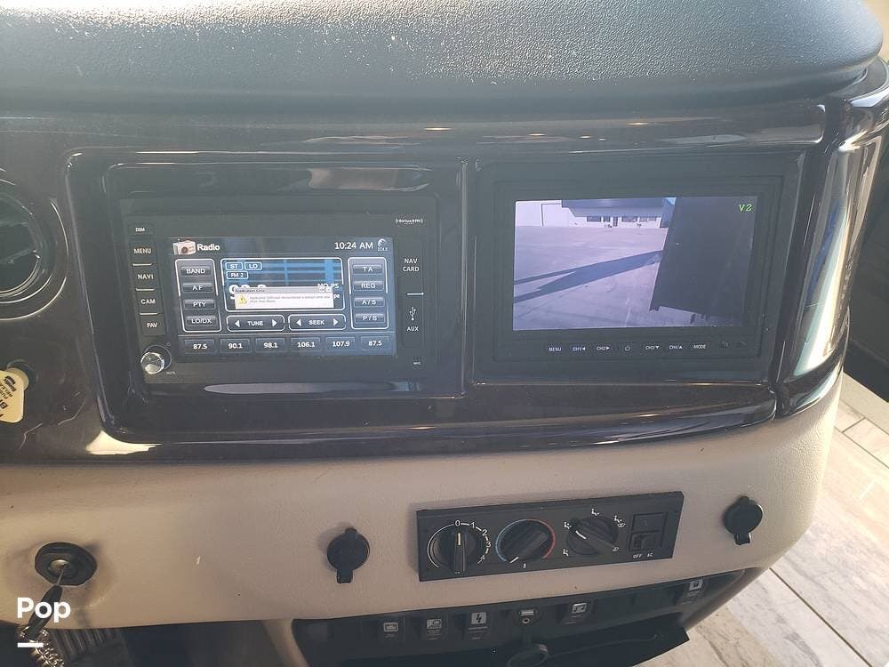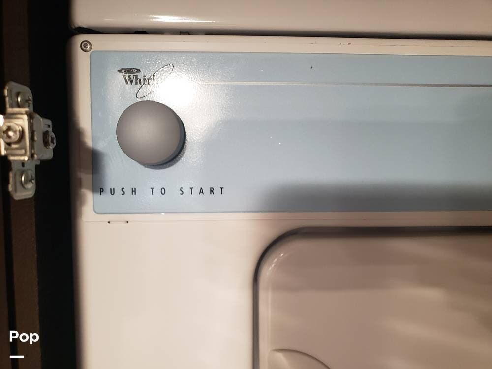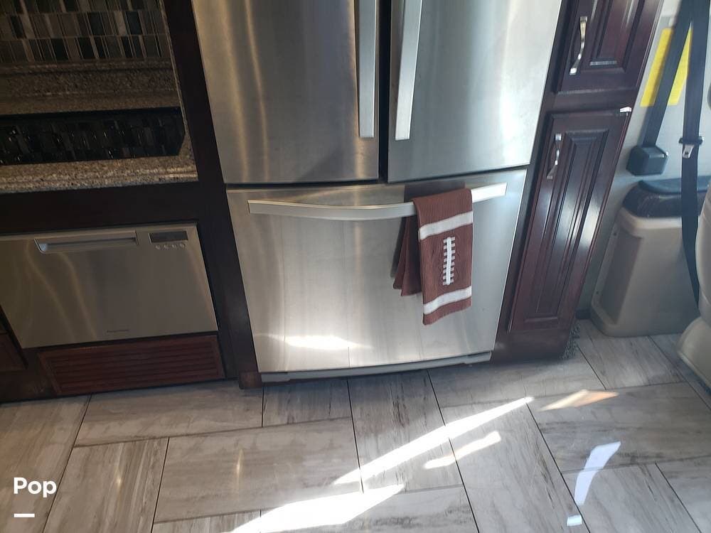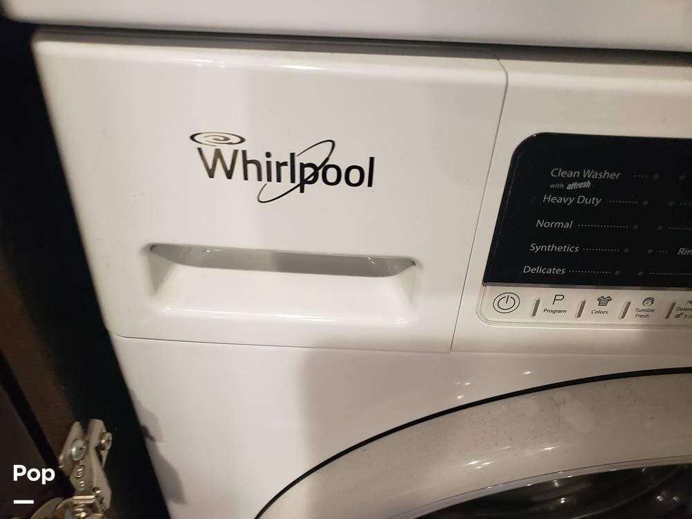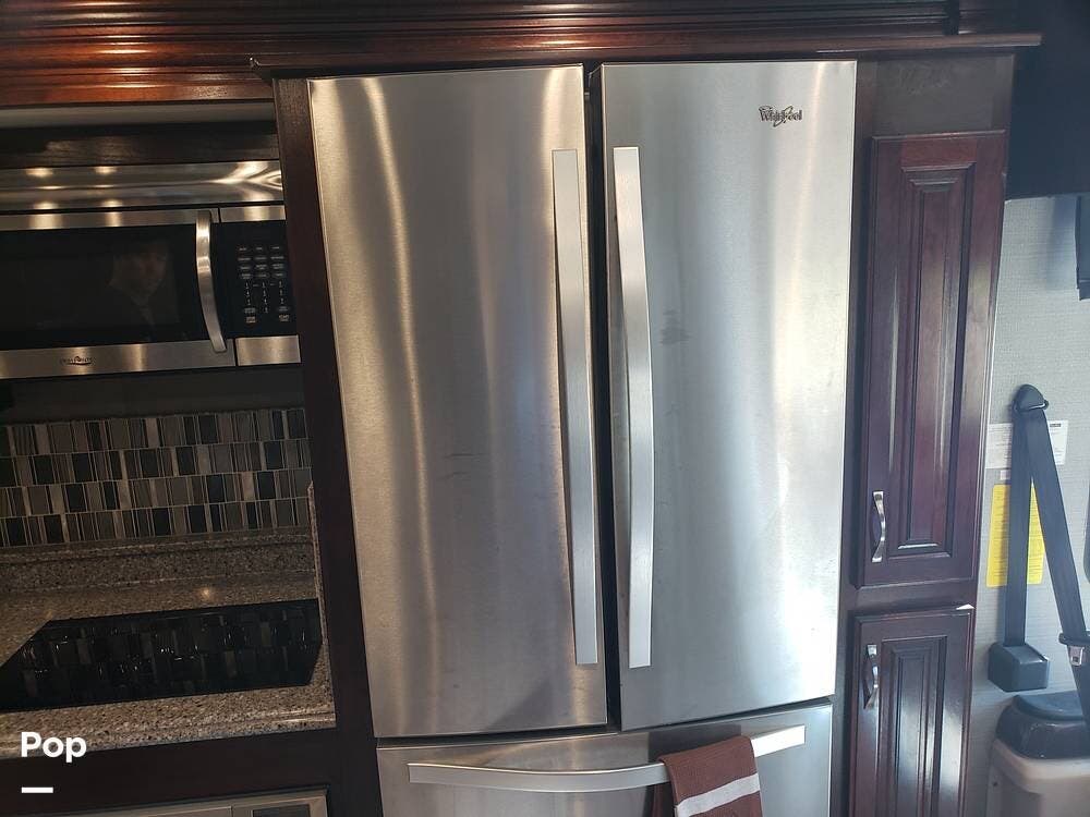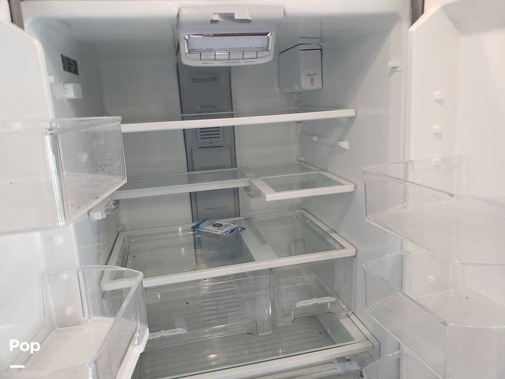 Entering through the entry door, which does have its own awning, you'll step into a tasteful interior that will make your adventures pleasurable. Straight ahead is a Whirlpool stainless three door residential refrigerator/freezer. There also is a TV on center over the cockpit.