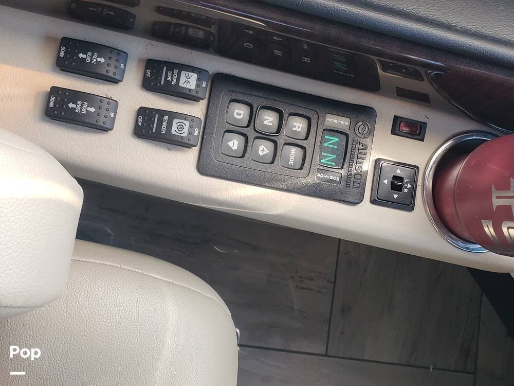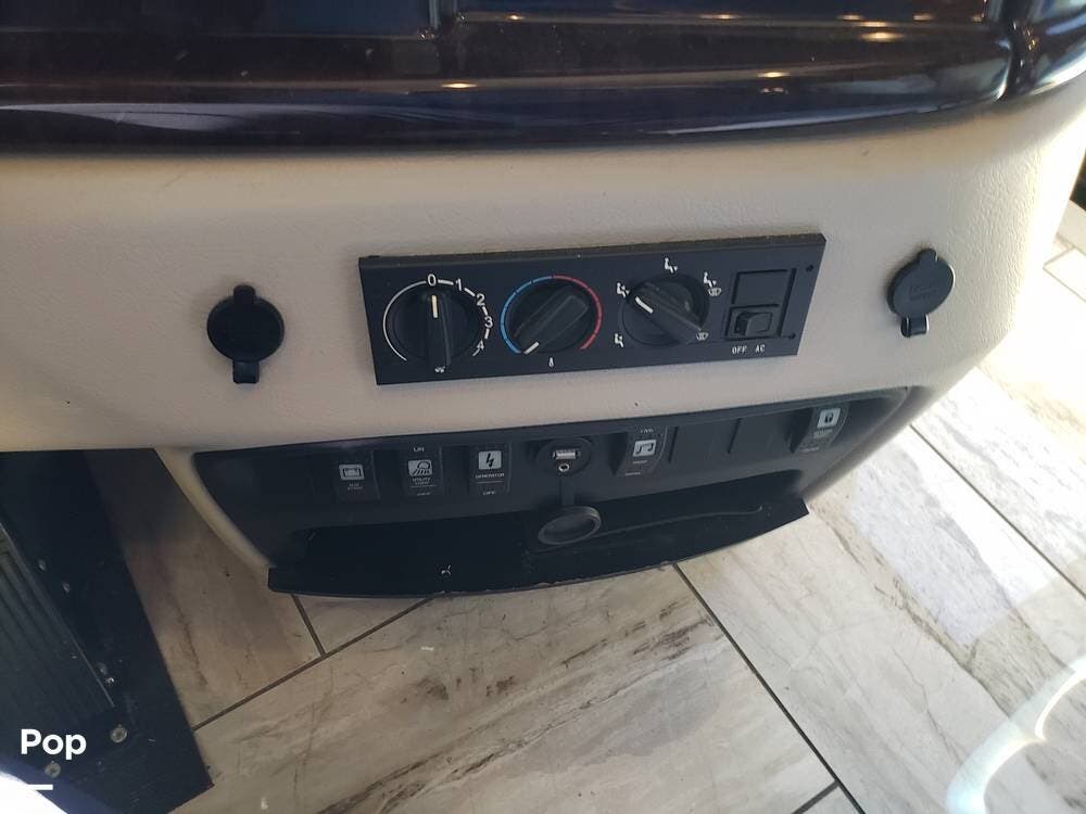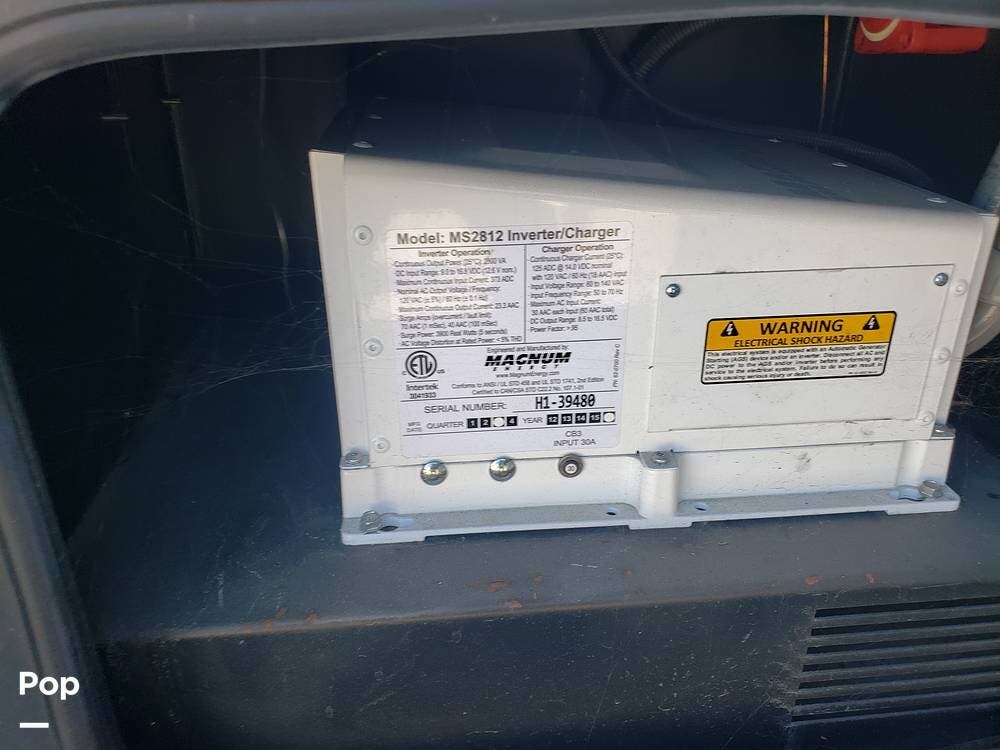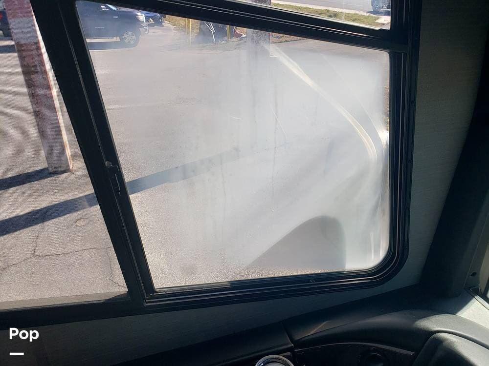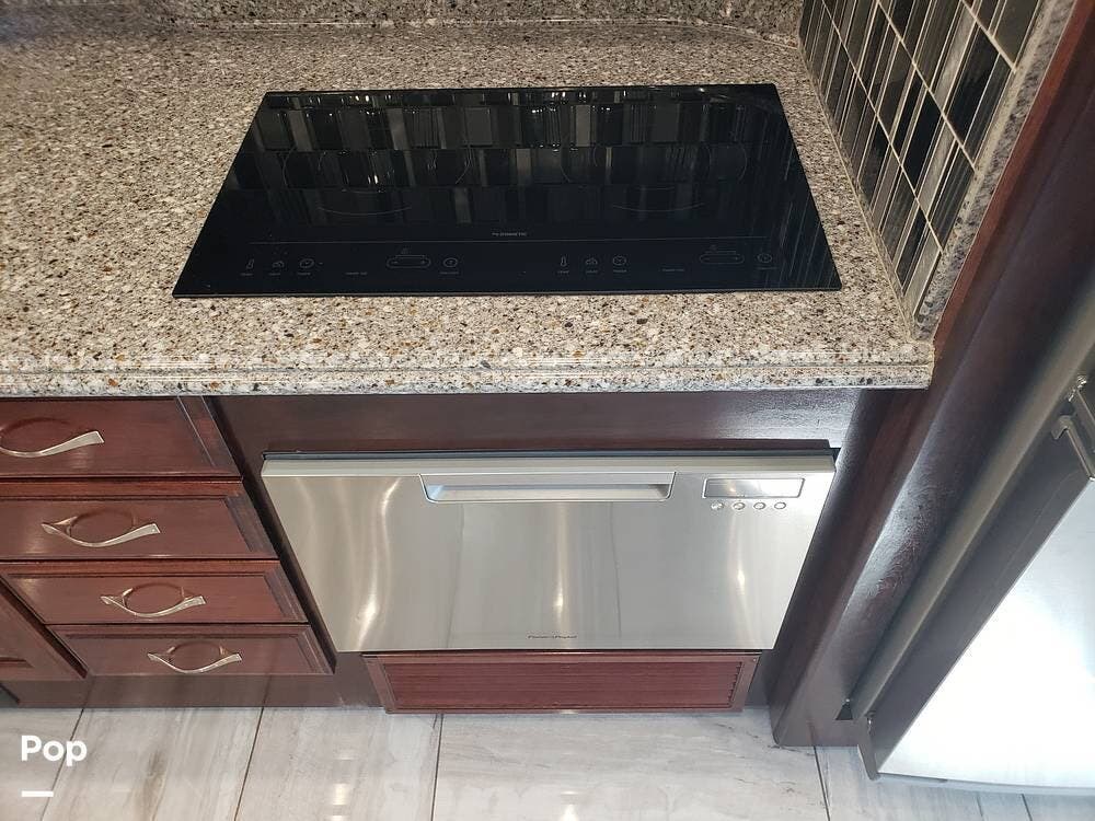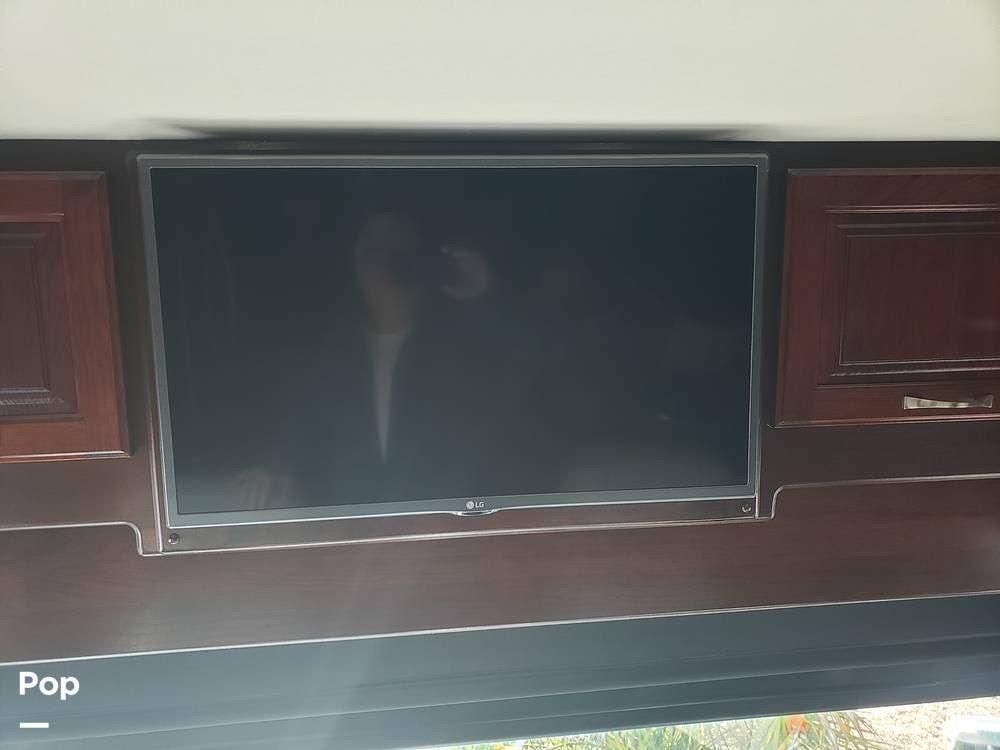 Entering through the entry door, which does have its own awning, you'll step into a tasteful interior that will make your adventures pleasurable. Straight ahead is a Whirlpool stainless three door residential refrigerator/freezer. There also is a TV on center over the cockpit.