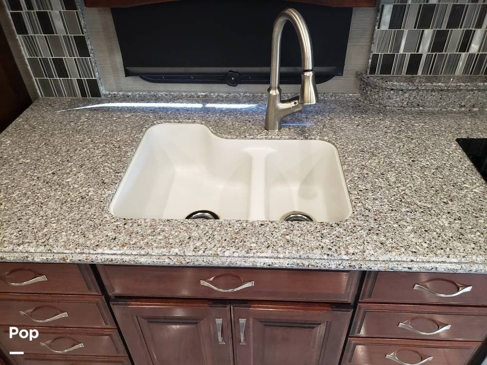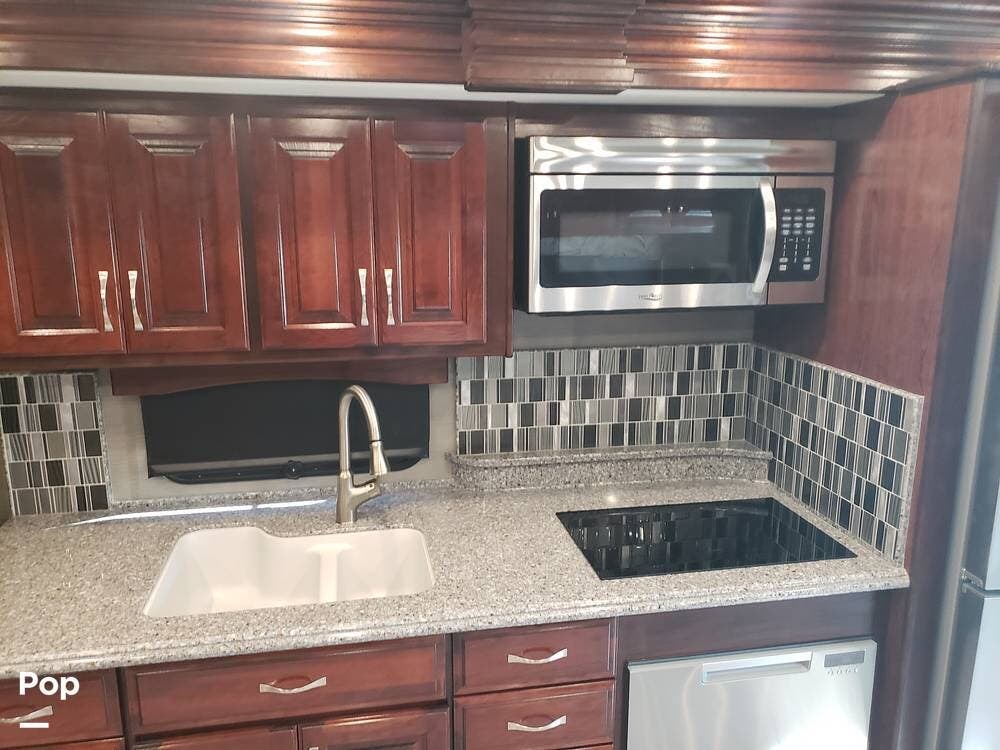The kitchen boasts a dishwasher, tile backsplash, stovetop, two-basin sink, microwave/convection oven, plenty of cabinets, and a flat screen TV.