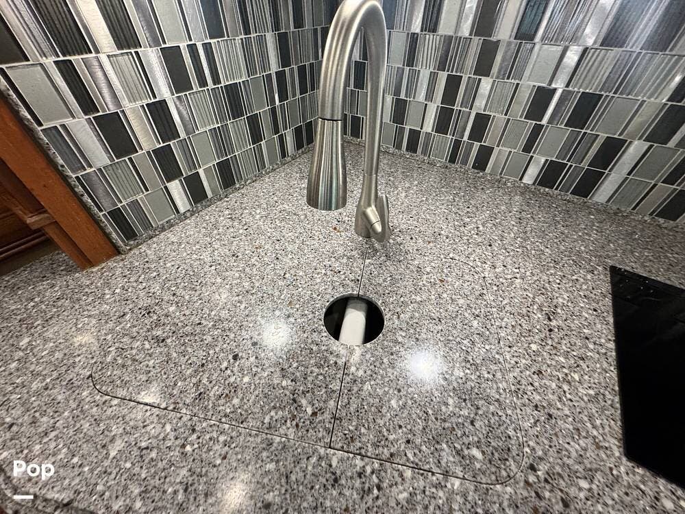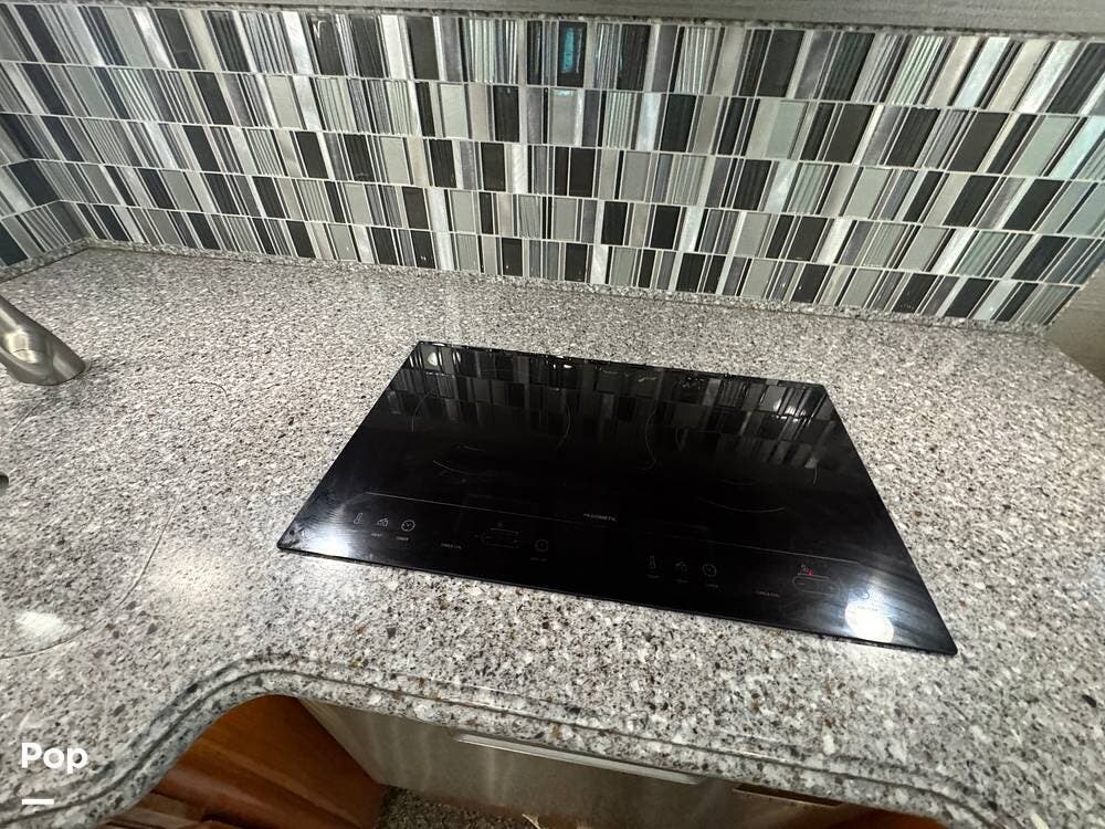 The kitchen features a dishwasher, a stainless-steel residential refrigerator/freezer (with icemaker), an induction cooktop, a microwave, a pantry, and a slide-out table with chairs.