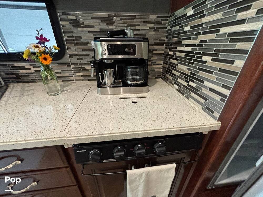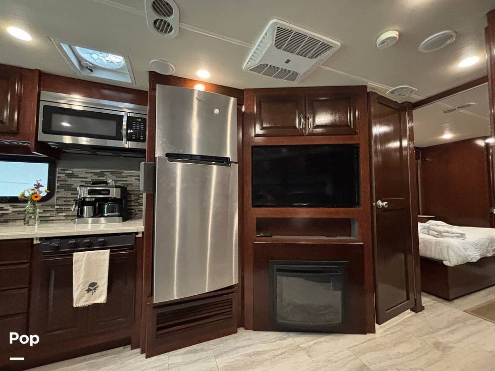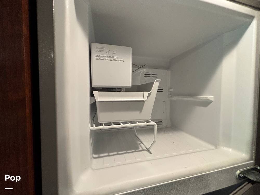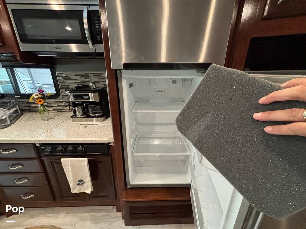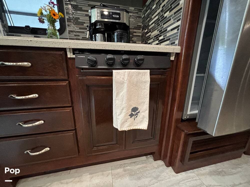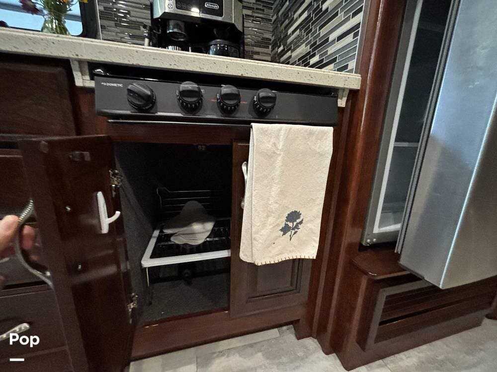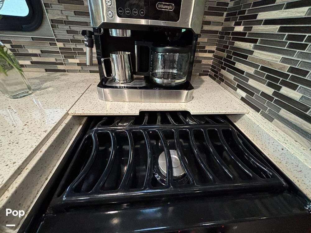 The full kitchen includes a residential-style refrigerator, 3-burner stove, and microwave convection oven, giving you everything you need to cook on the go.