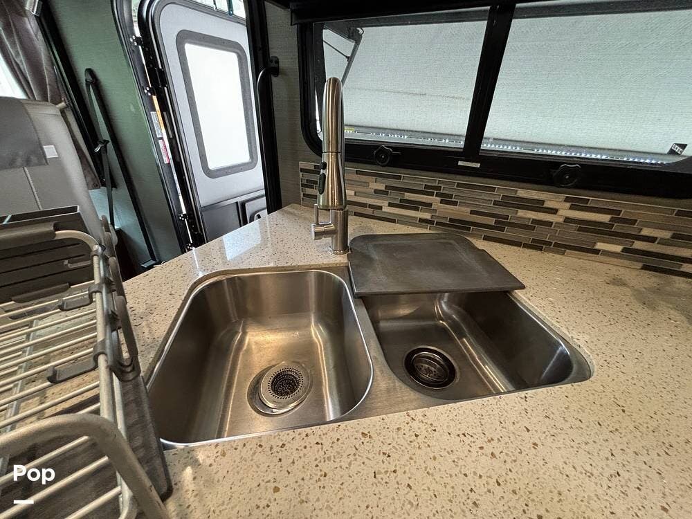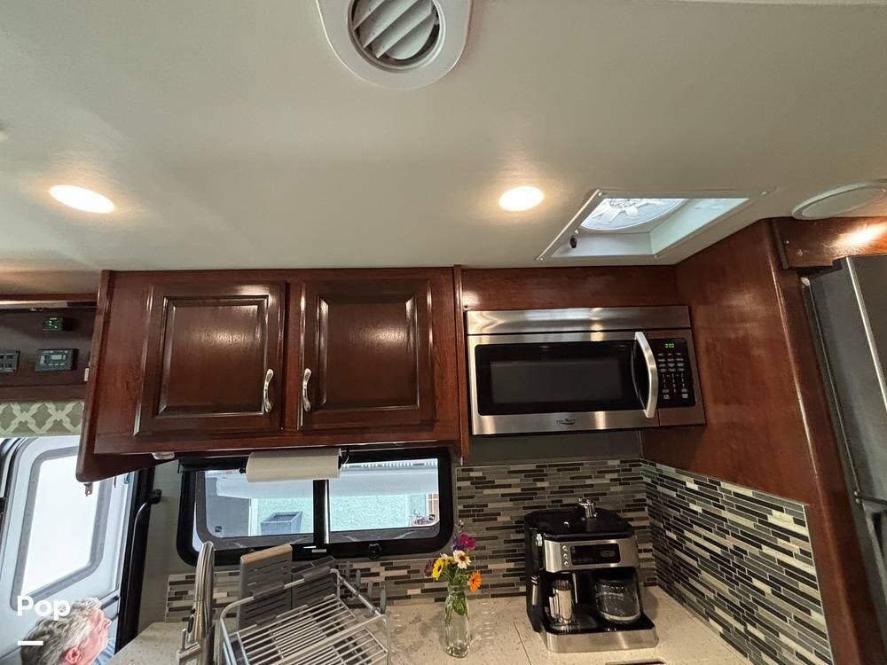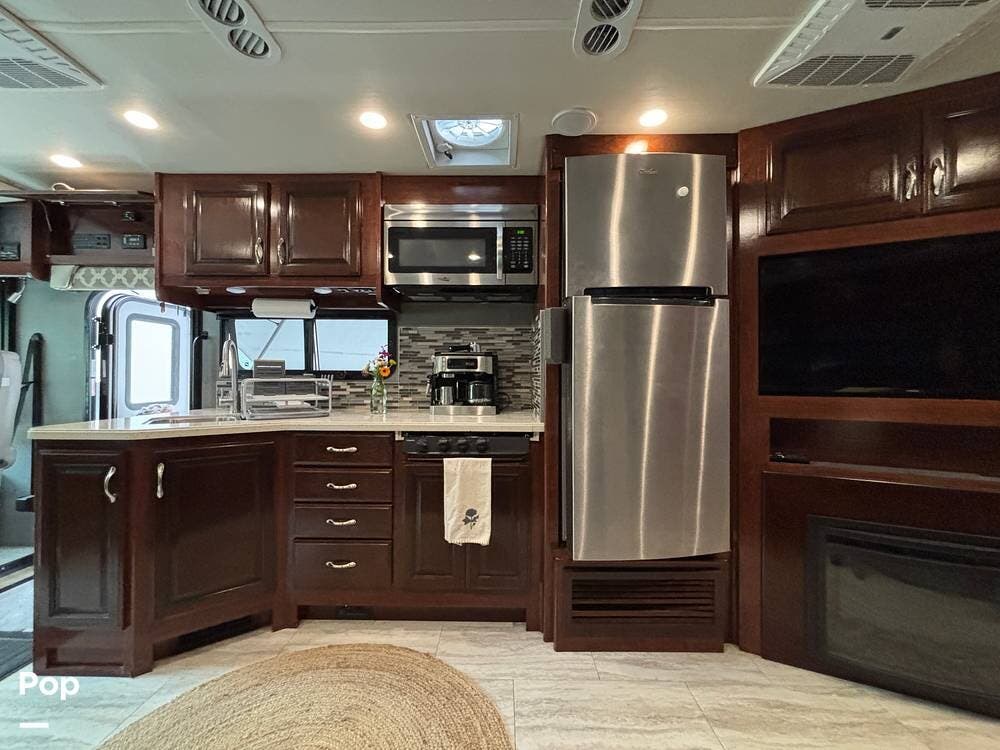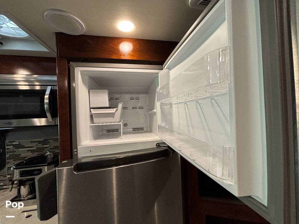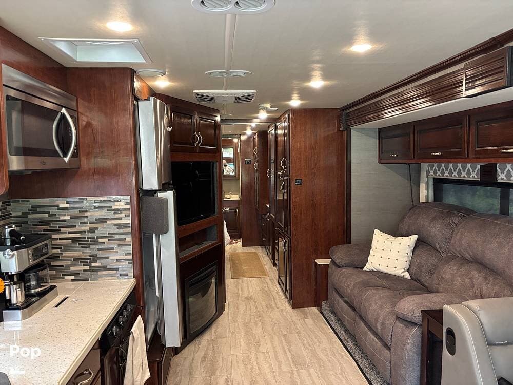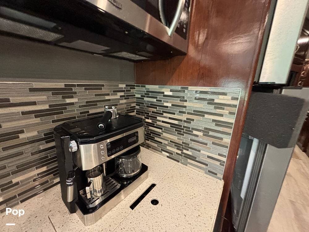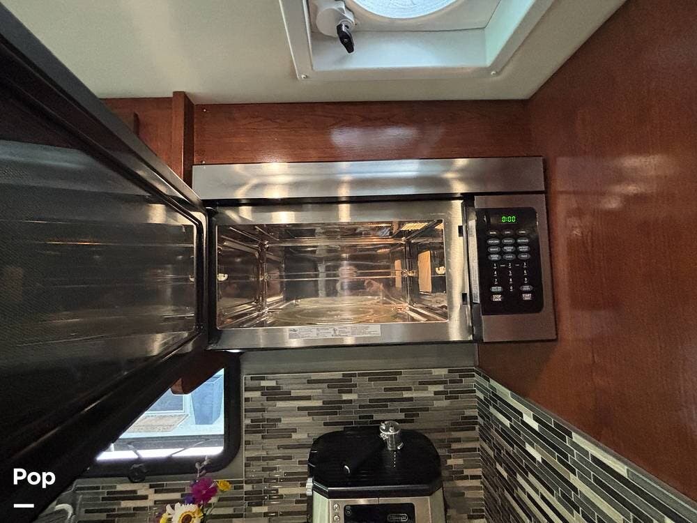 The full kitchen includes a residential-style refrigerator, 3-burner stove, and microwave convection oven, giving you everything you need to cook on the go.